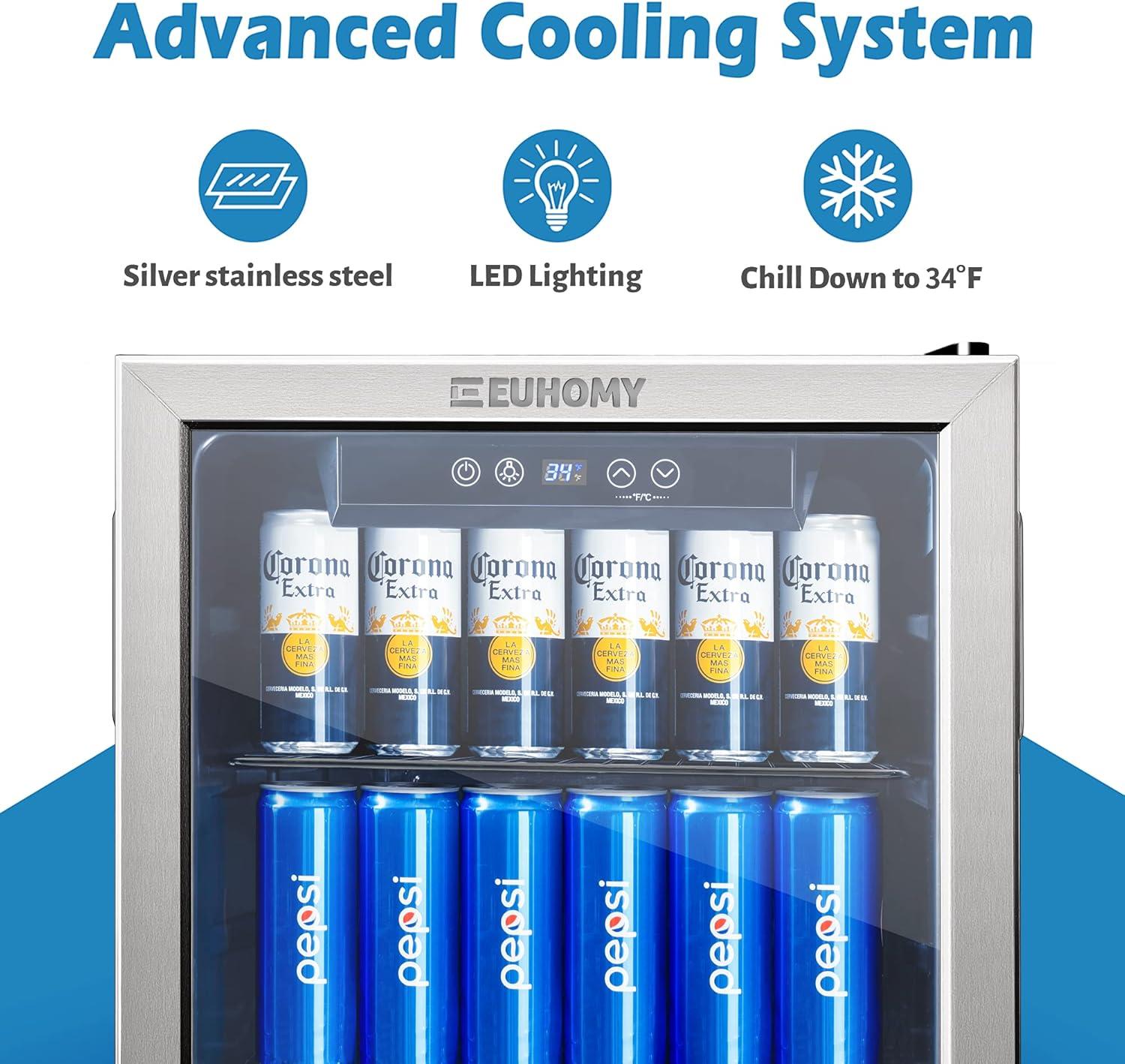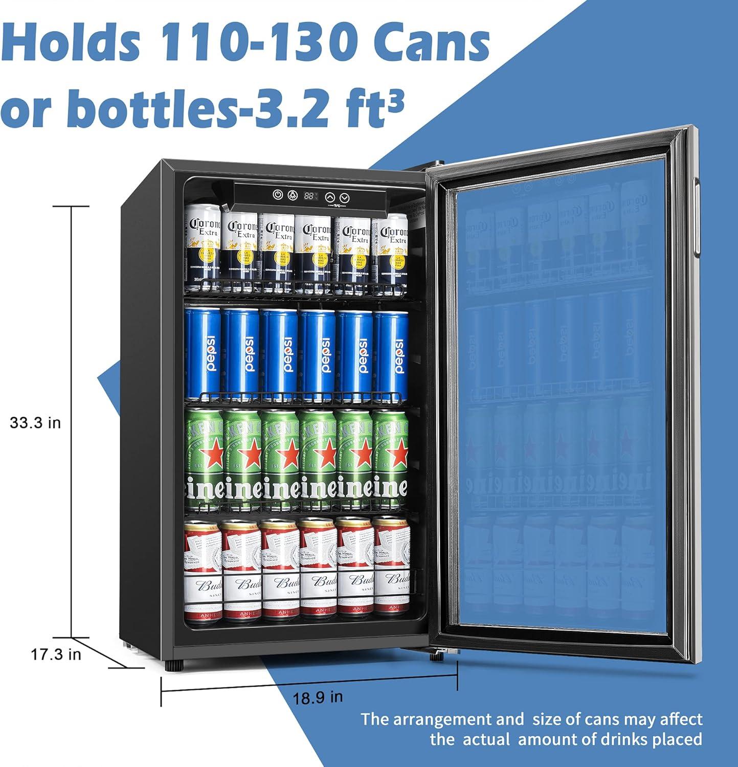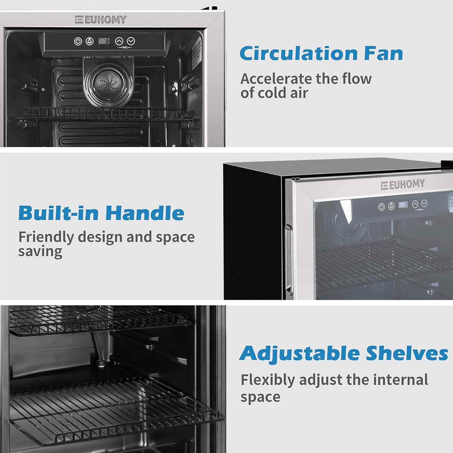Spacious Storage: The EUHIMY bar fridge with glass door can hold up to 328 cans or 100 bottles of beer, wine, or soda, thanks to its 4 adjustable shelves. You can easily rearrange the shelves to fit various sizes of drinks, keeping everything organized. This bar refrigerator ensures all your beverages are stored efficiently and neatly