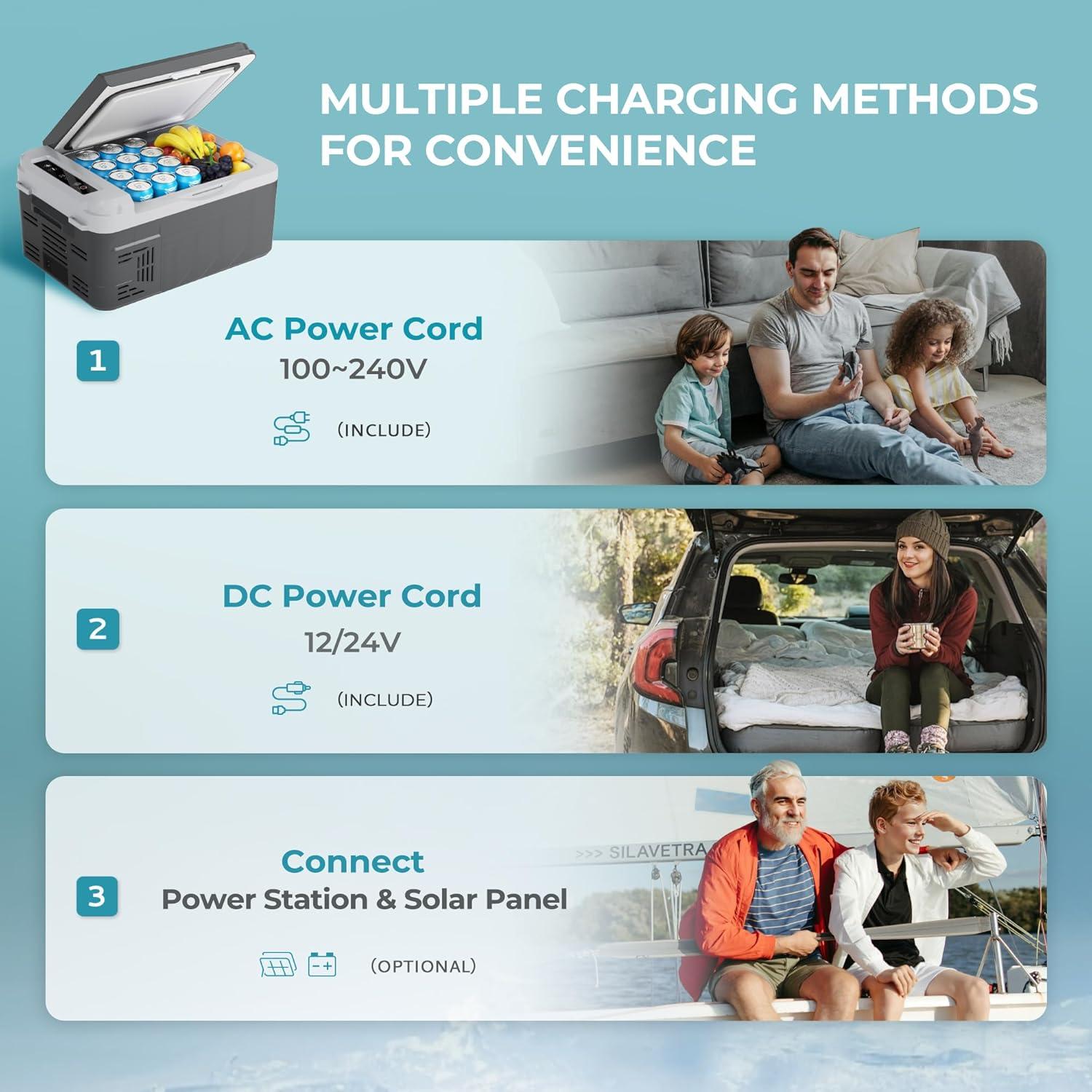 Battery protection and multiple power sources: This camping fridge offers 3 level battery protection, allowing you to adjust the input power between L/M/H modes to prevent overload or vehicle battery drain. The 12v fridge can be powered by both DC and AC, suitable for a variety of scenarios.