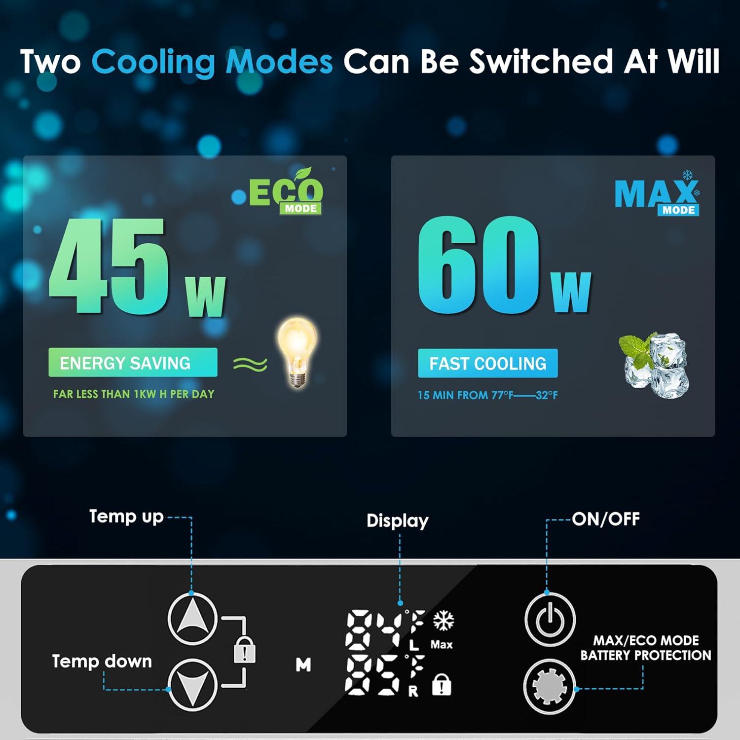 LCD Control Panel & Dual Mode:This car freezer features a simple LCD control panel for easy temperature and mode adjustments. This portable refrigerator is UL certified for energy efficiency, features an energy-saving ECO mode and a fast-cooling MAX mode, and consumes only 45W of energy on average.