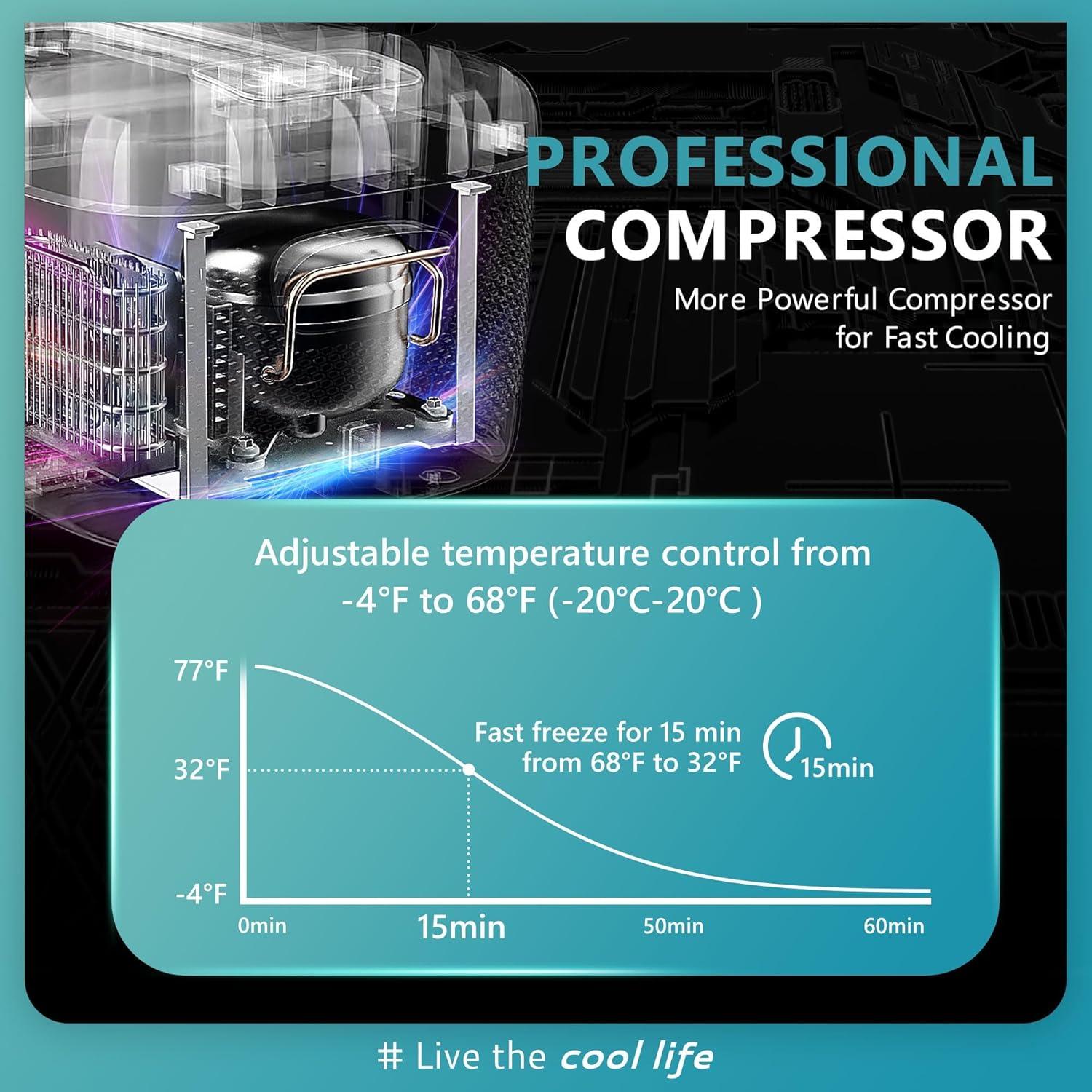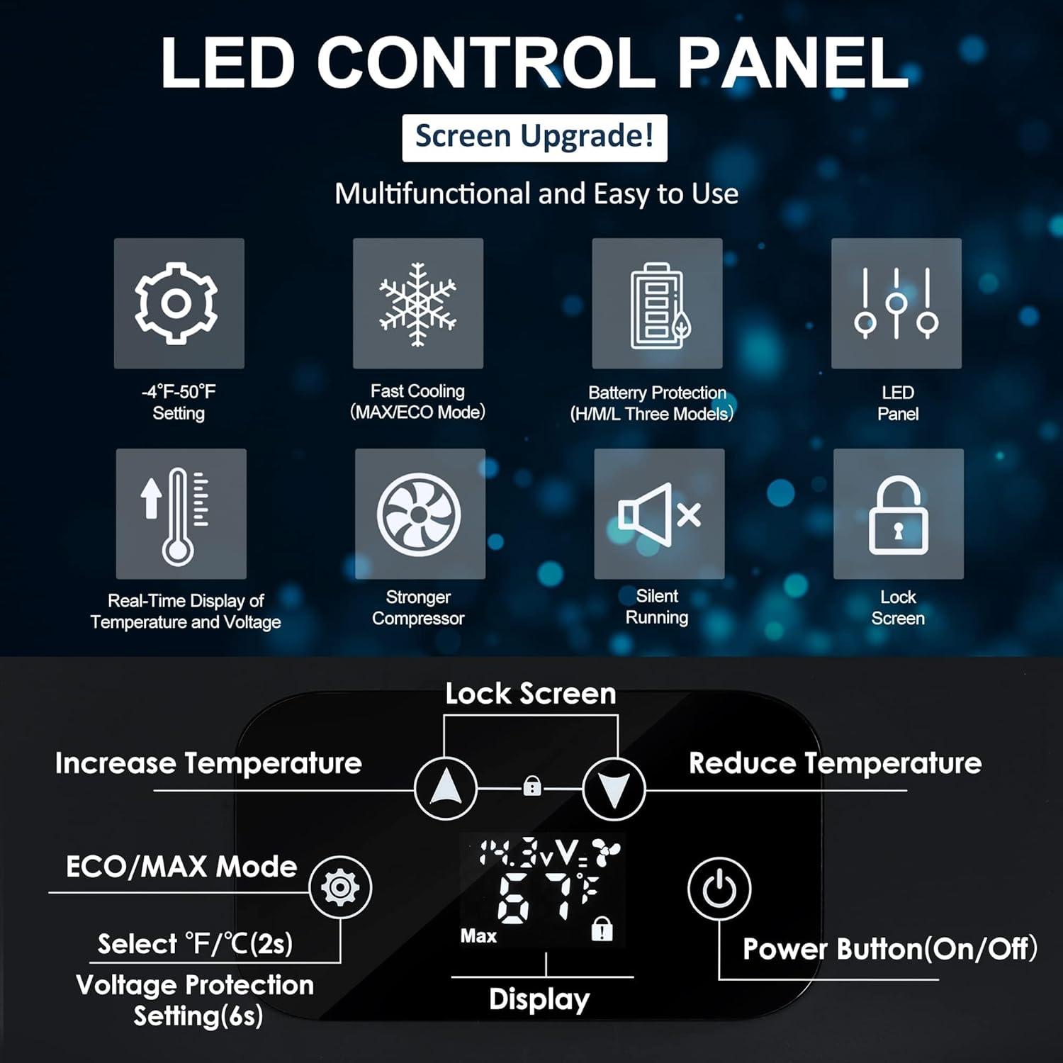 Fast Cooling & Low Energy Consumption; This portable refrigerator features a high-efficiency inverter compressor for rapid cooling. UL energy-certified, the 12v freezer offers both ECO mode for energy savings and MAX mode for fast cooling, operating at just 45W for efficient energy use