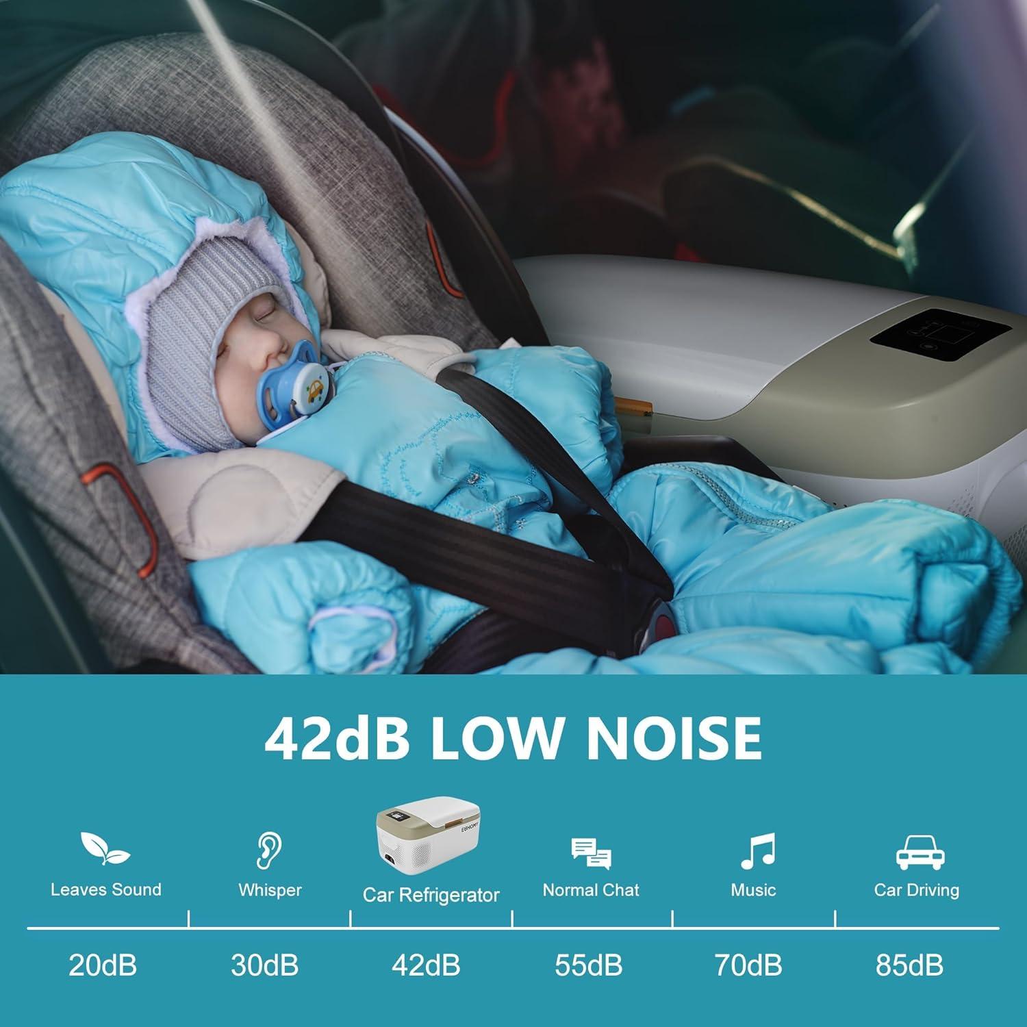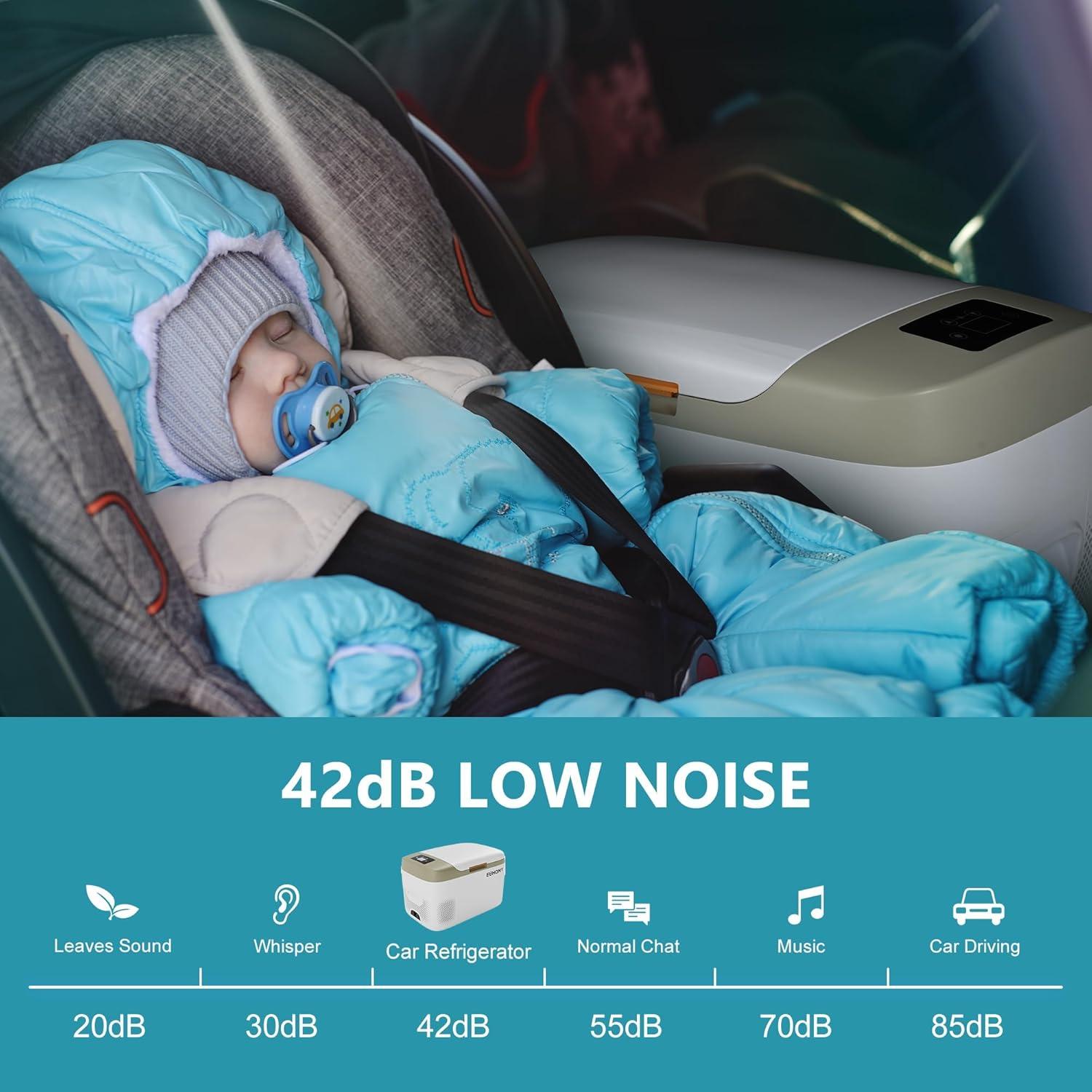 Silent & Anti-shock Design; The portable refrigerator for car operates quietly at just 40 decibels, providing a comfortable environment. Designed with an anti-shock system and a multifunctional anti-slip base, this camping fridge works smoothly even on rugged slopes up to 35 degree
