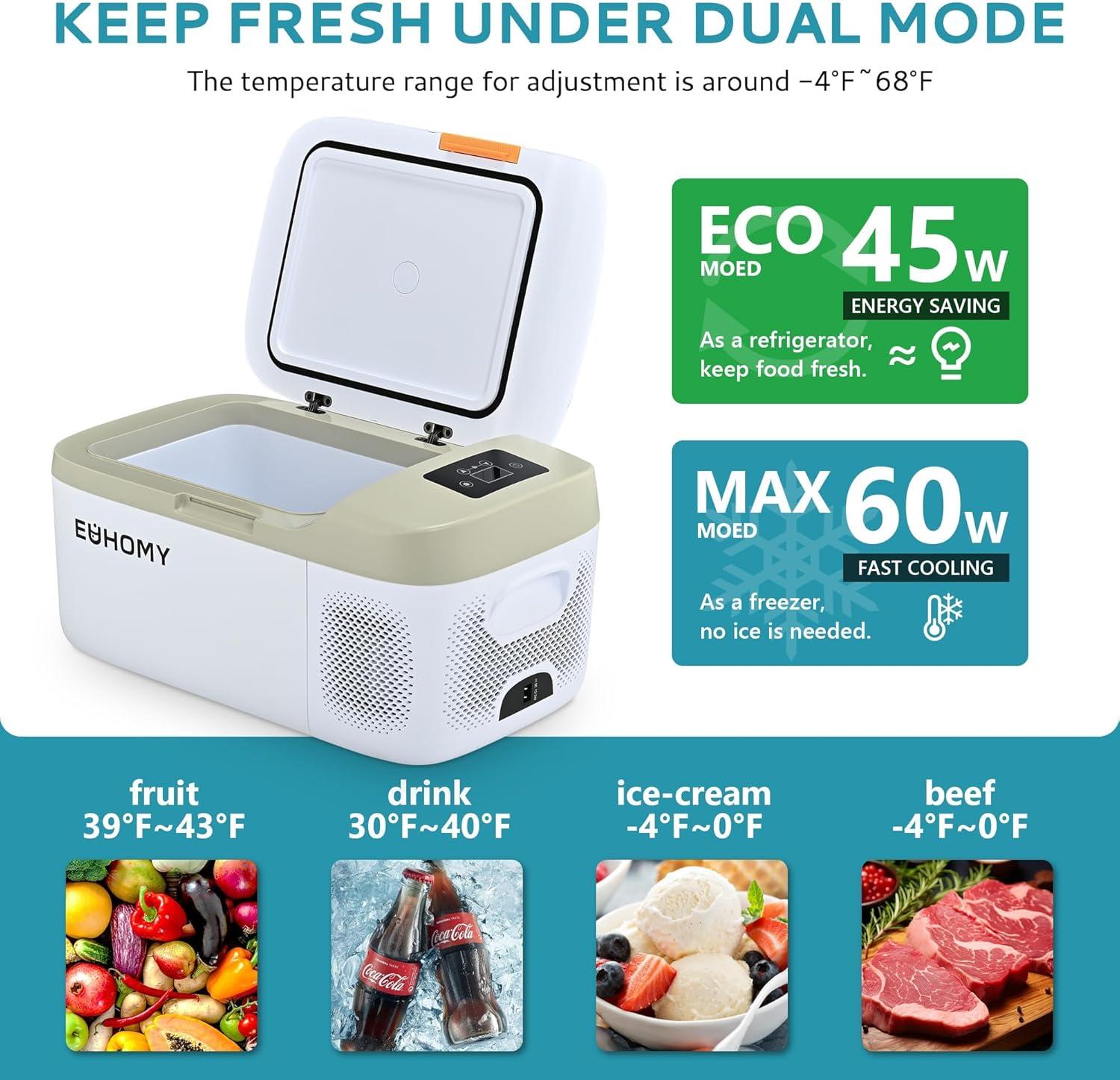 Package Inclusions & 2-Year Technical Support; EUHOMY 12v refrigerator is equipped with 100/240V AC and 12/24V DC adapters and can be used at home or in the car for a variety of use scenarios. The 12v cooler offers a 2-year technical support. If you have any questions about our portable freezer, please reach out to EUHOMY, and we will help you as soon as possible