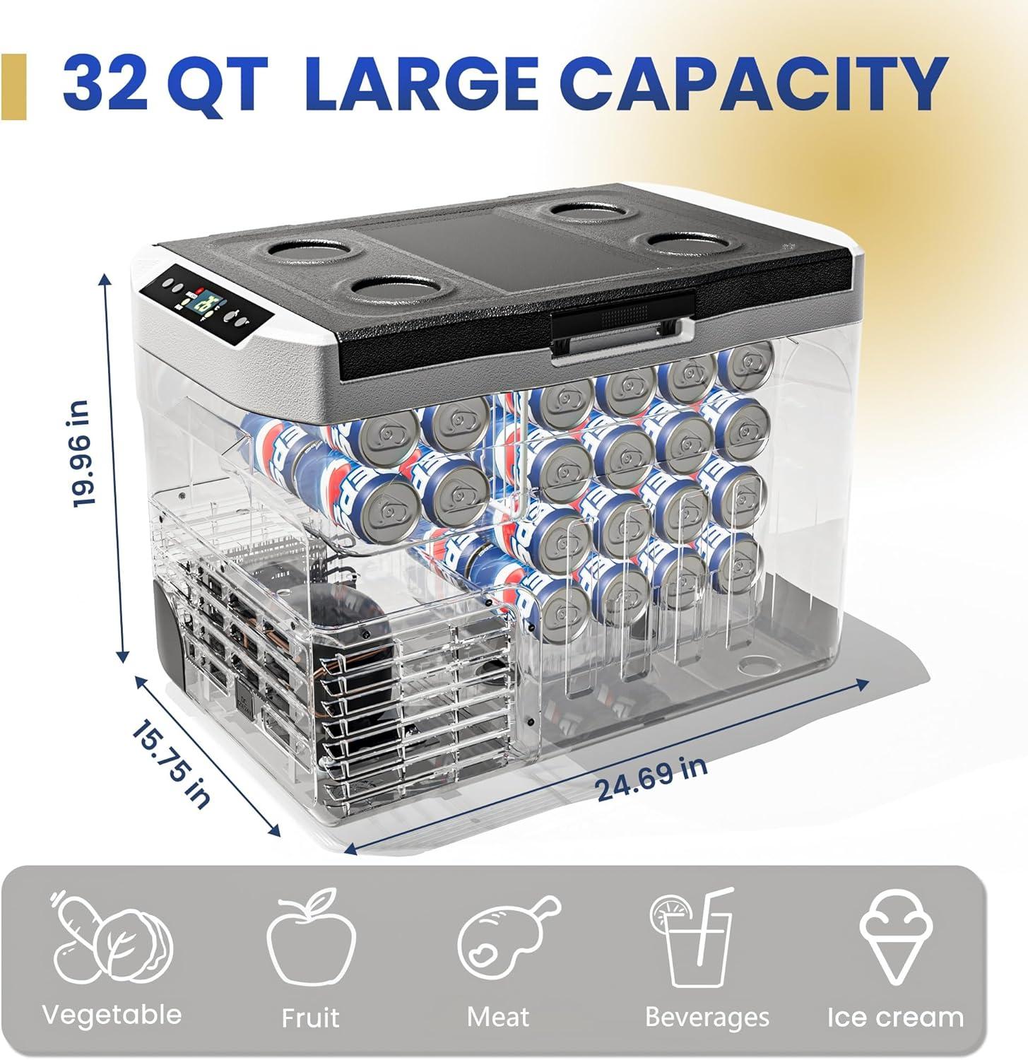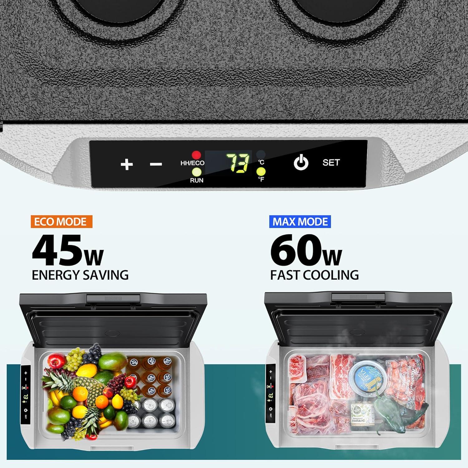 Fast Cooling & Low Energy Consumption; The 12v refrigerator features an advanced variable frequency compressor that cools from 68°F to 32°F in just 15 minutes. The electric cooler offers both an energy-saving ECO mode and a fast-cooling MAX mode, consuming only 45W of power, certified by UL for energy efficiency