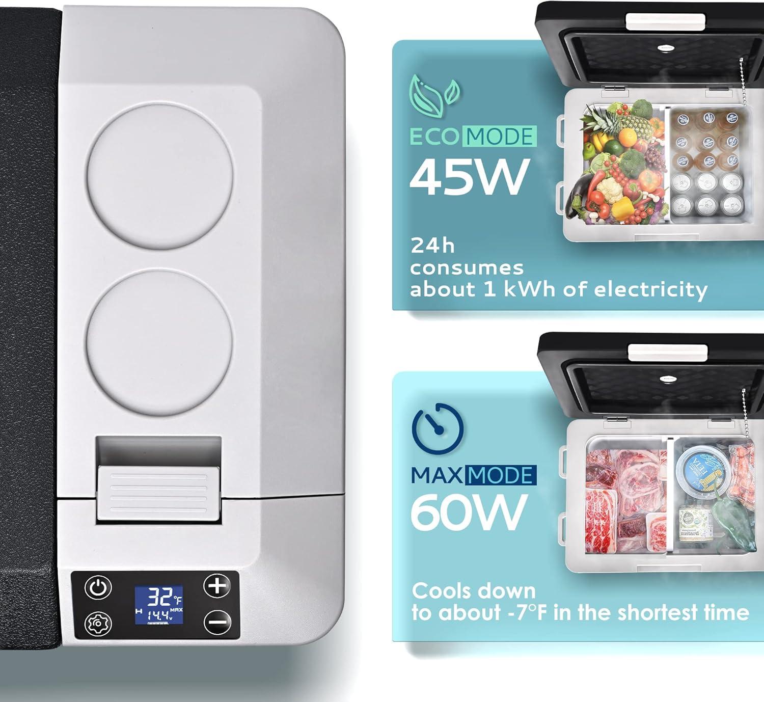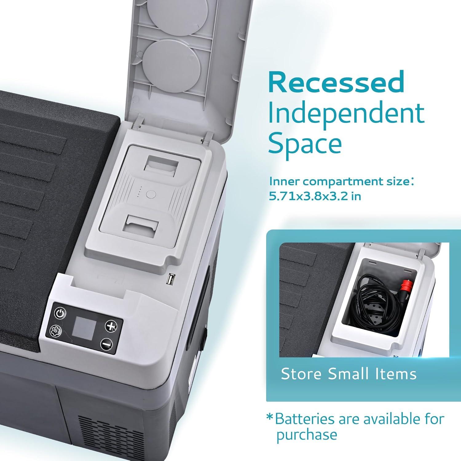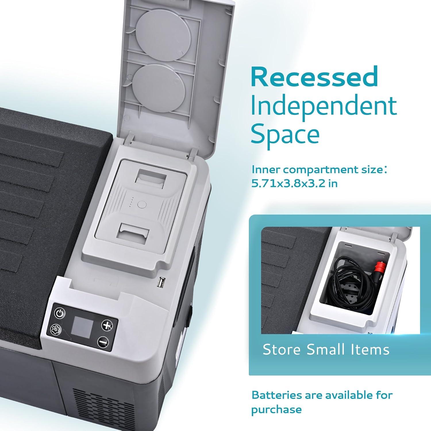 Independent Storage Spacet & Powerful Compressor; This portable refrigerator comes with a specialized compartment that not only acts as a power/charging station, but also serves as a handy storage space for small essentials. The battery powered cooler is equipped with a high-efficiency compressor that cools from 77°F to 32°F in just 15 minutes, with an average energy consumption of just 45W