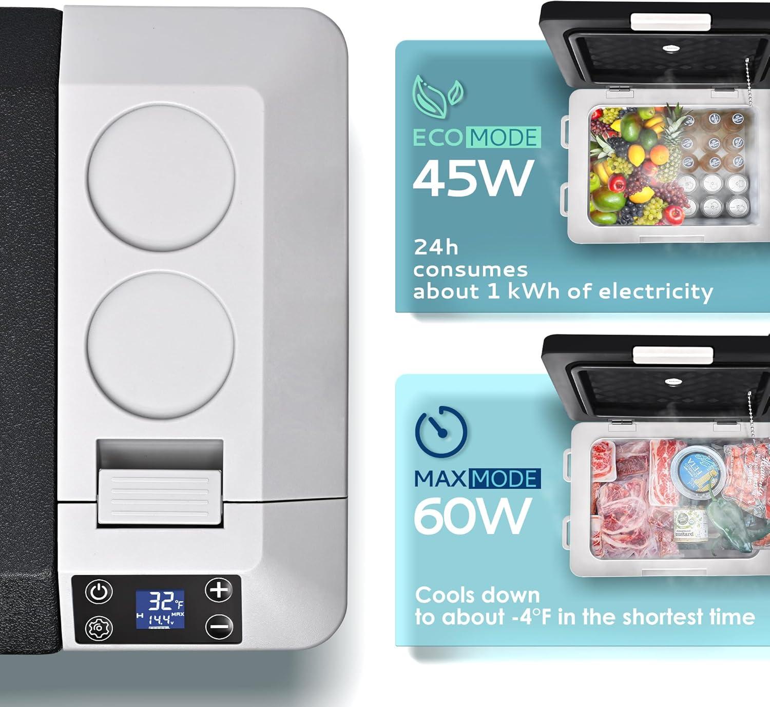 Battery Protection & Multiple Power Supplies; The 12 volt cooler features a three-level battery protection system, adjustable from 9.6V to 12.4V in L/M/H modes, preventing overload or vehicle battery drain. This protection makes the camping fridge suitable for use in sedans, SUVs, trucks, and most other vehicles. It can be powered by either DC or AC, making it versatile for various scenarios