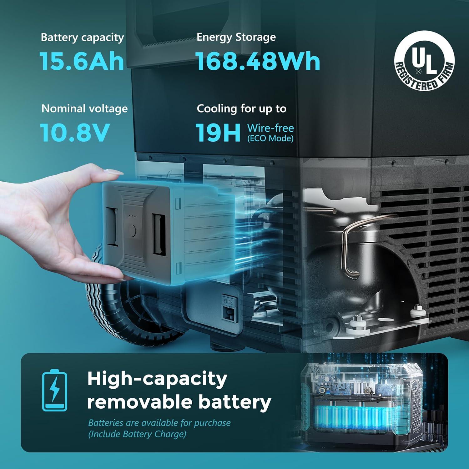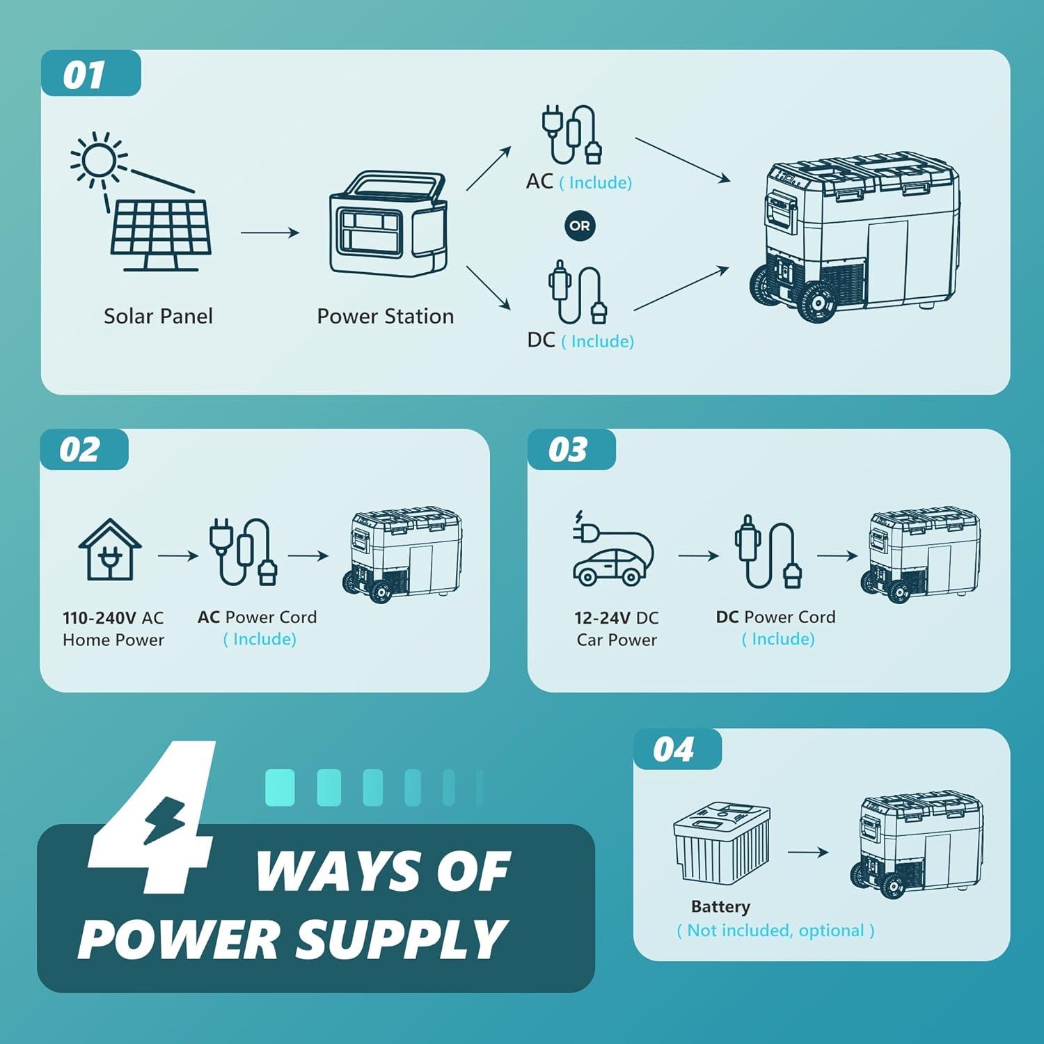Battery Protection & Multiple Power Supplies; The 12v fridge freezer offers 3-level battery protection, with input power adjustable from 9.6V to 12.4V in L/M/H modes, preventing overload or vehicle battery drain. Compatible with a wide range of vehicles, the 12 volt refrigerator freezer can be powered by DC/AC cords or batteries, making it ideal for various scenarios (Note: Battery sold separately; currently out of stock, but can be pre-ordered by customer service)