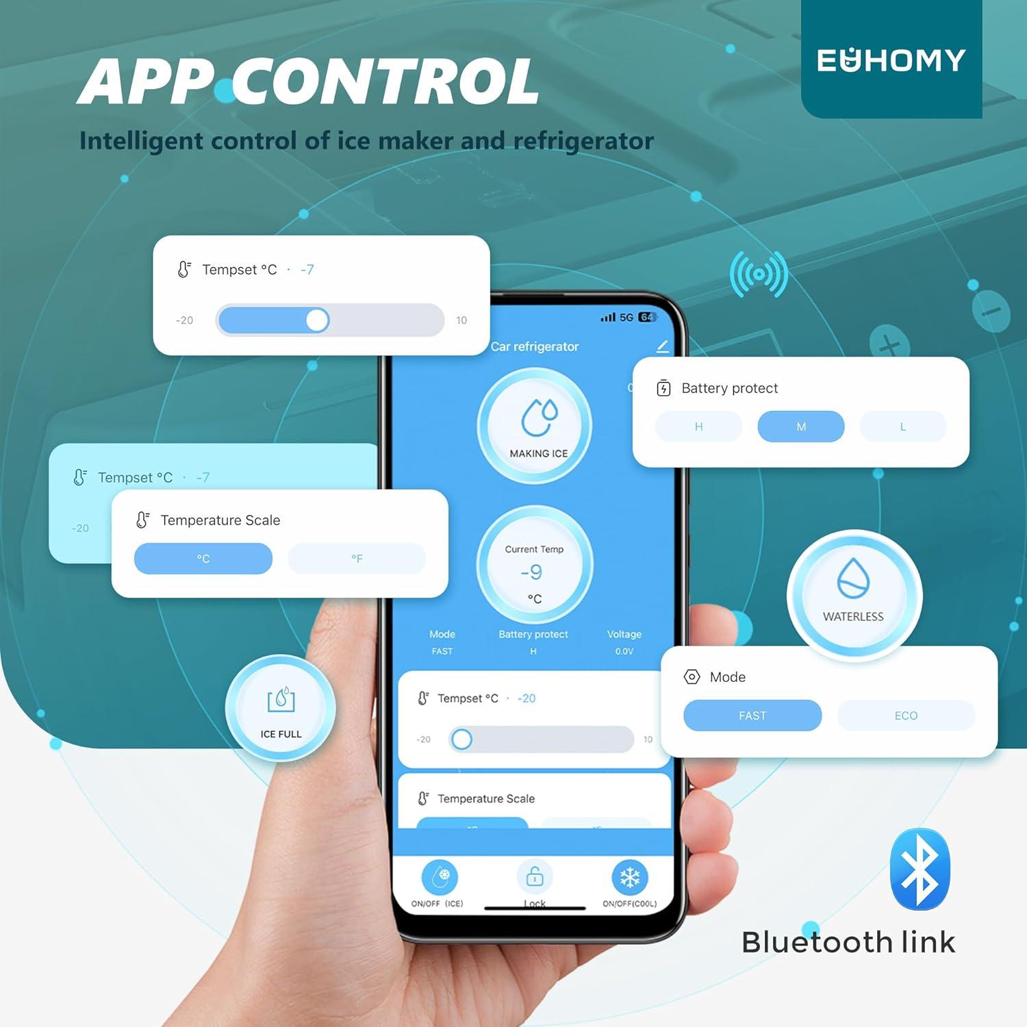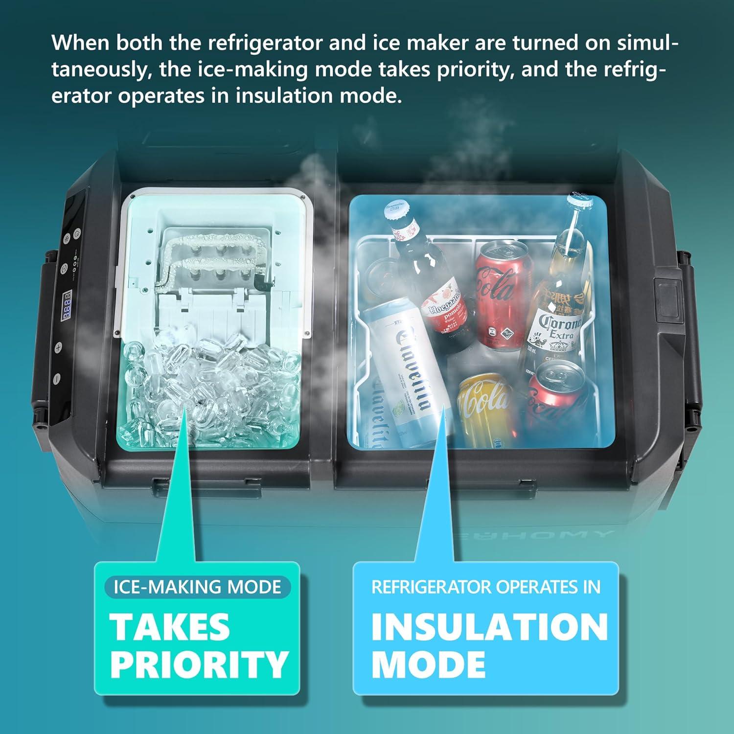 2-in-1 Design; EUHOMY introduces an innovative 2-in-1 12v fridge and 12 volt ice maker. The automatic ice maker, powered by a strong compressor, quickly produces 6 ice cubes in just 8 minutes, up to 17.5 lbs/24 hrs. The large ice storage basket of the 12 volt refrigerator holds up to 100 cubes. Simple ice-making at the touch of a button (Note: Ice making and cooling cannot operate simultaneously)