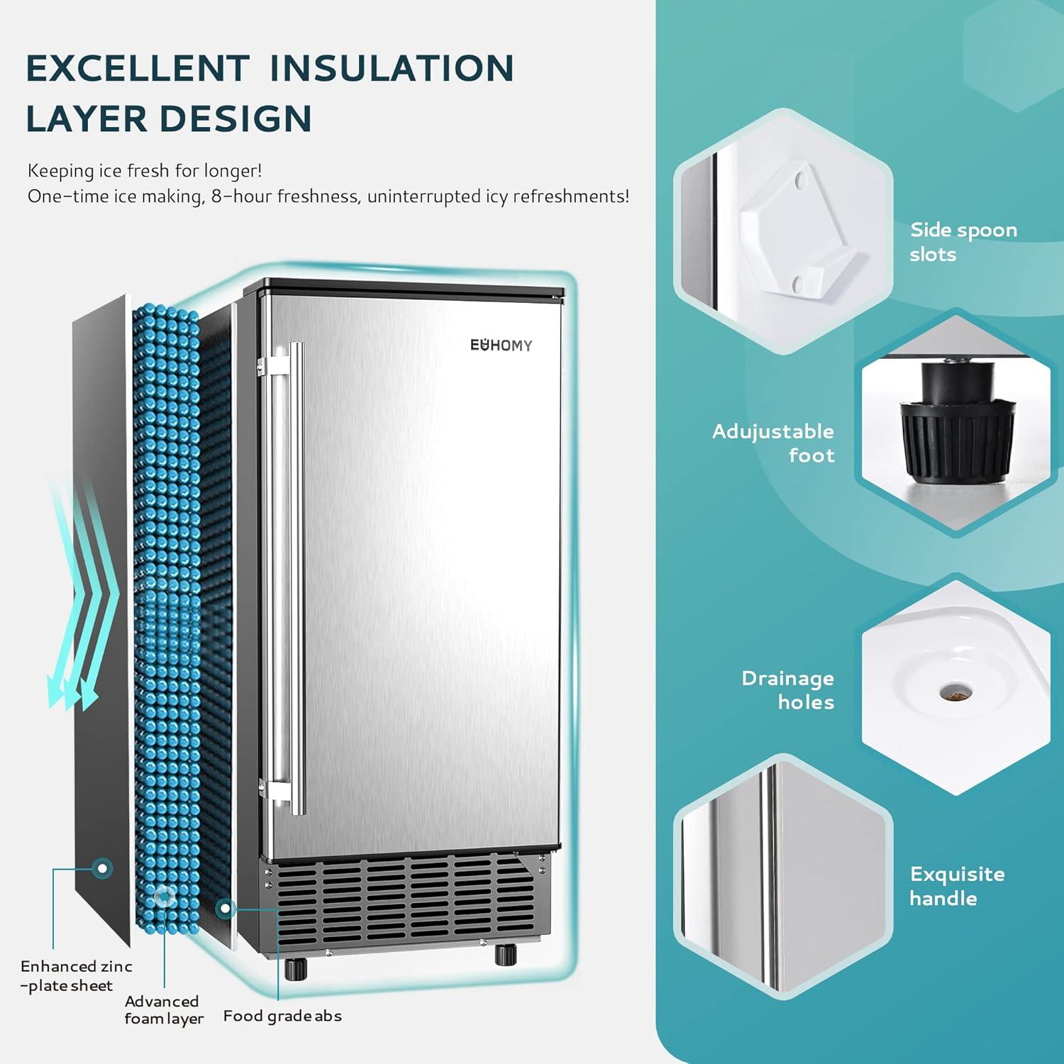 EUHOMY 15" W Commercial Under Counter Ice Maker Machine, 90 Lb/Day Auto-Cleaning & 24H Timer, Gravity Drainage,Stainless Steel Built-in Freestanding Ice Maker, 24 Lb Bin, Ideal for Commercial & Home(90lbs/day)