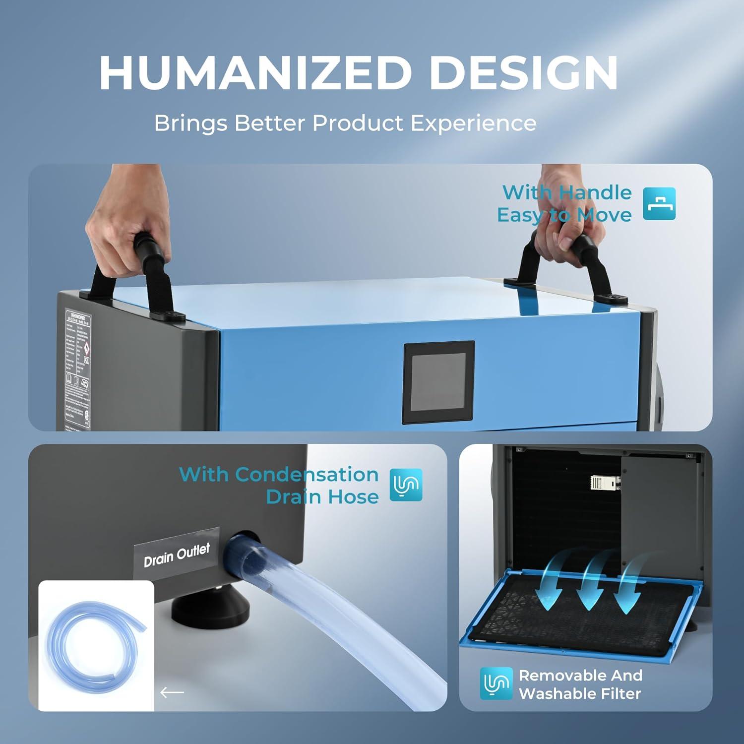 【Easy to Move & User-Friendly Design】The home dehumidifier has handles on the side and wheels on the bottom, so it can be easily moved to various places. The washable filter is easy to remove and can be easily installed, we recommend you to clean it once a month. And we also provide an adjustable strap that can store plug cords, no need to worry about plug cords nowhere to place.