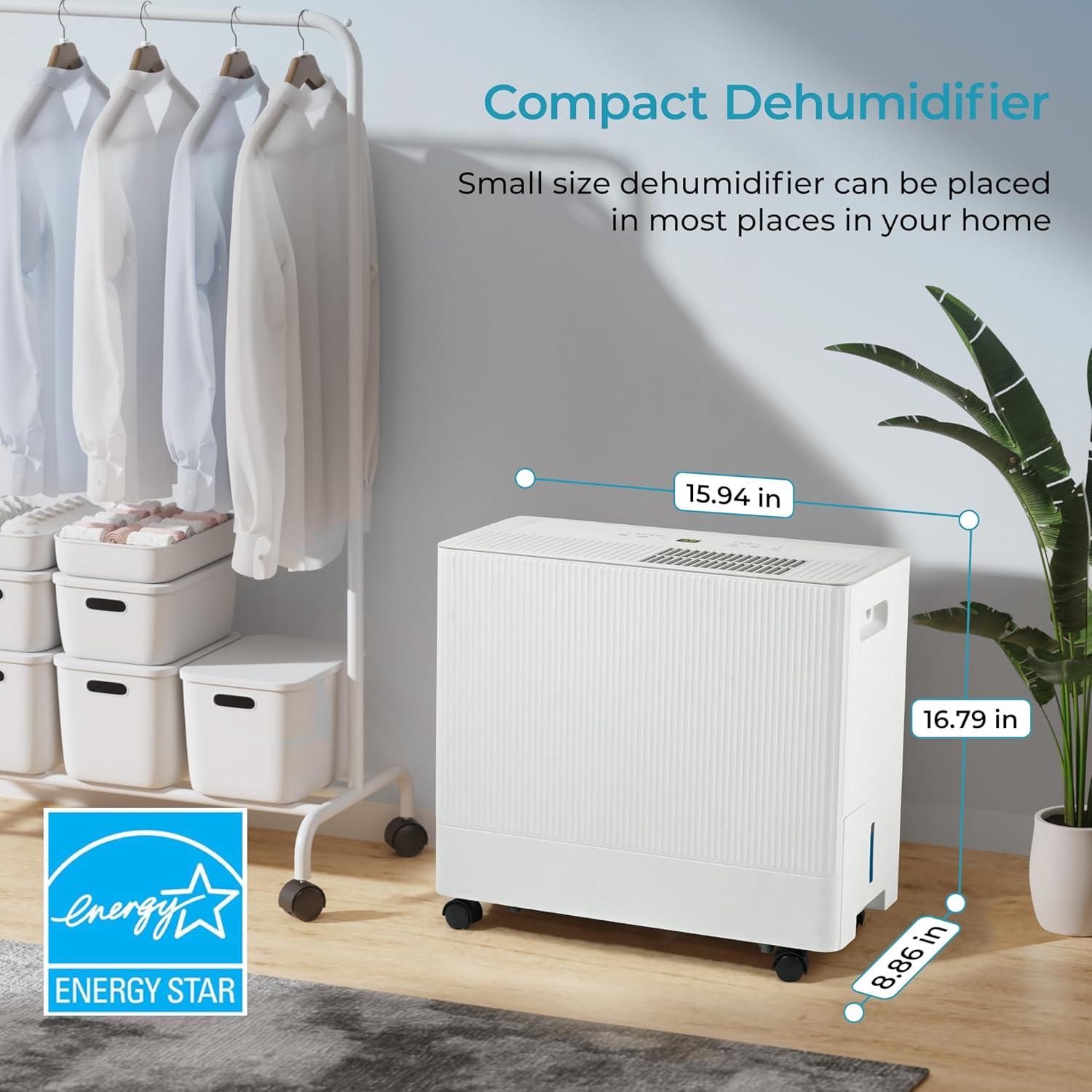 【Special Appearance & Space-Saving Design】Different from other types of dehumidifiers on the market, our appearance is designed to be long and flat. In daily use, you can put it in the gap between the cabinet and the wall, or put it under the table against the corner. It is very suitable for families with no extra space at home. The size is 15.94″ * 16.79″ * 8.86″.