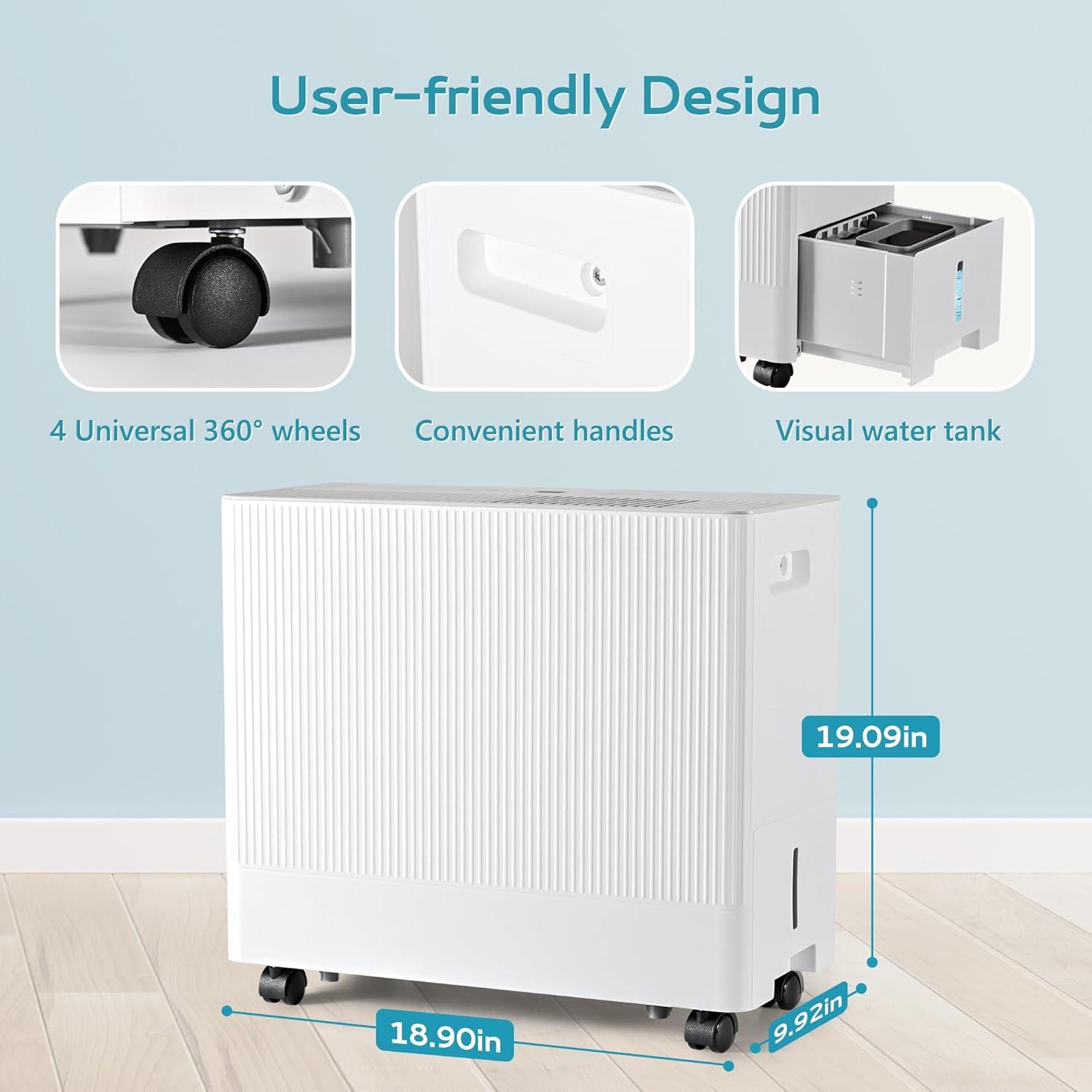 【Easy to Move & User-Friendly Design】The home dehumidifier has handles on the side and wheels on the bottom, so it can be easily moved to various places. The washable filter is easy to remove and can be easily installed, we recommend you to clean it once a month. And we also provide an adjustable strap that can store plug cords, no need to worry about plug cords nowhere to place.
