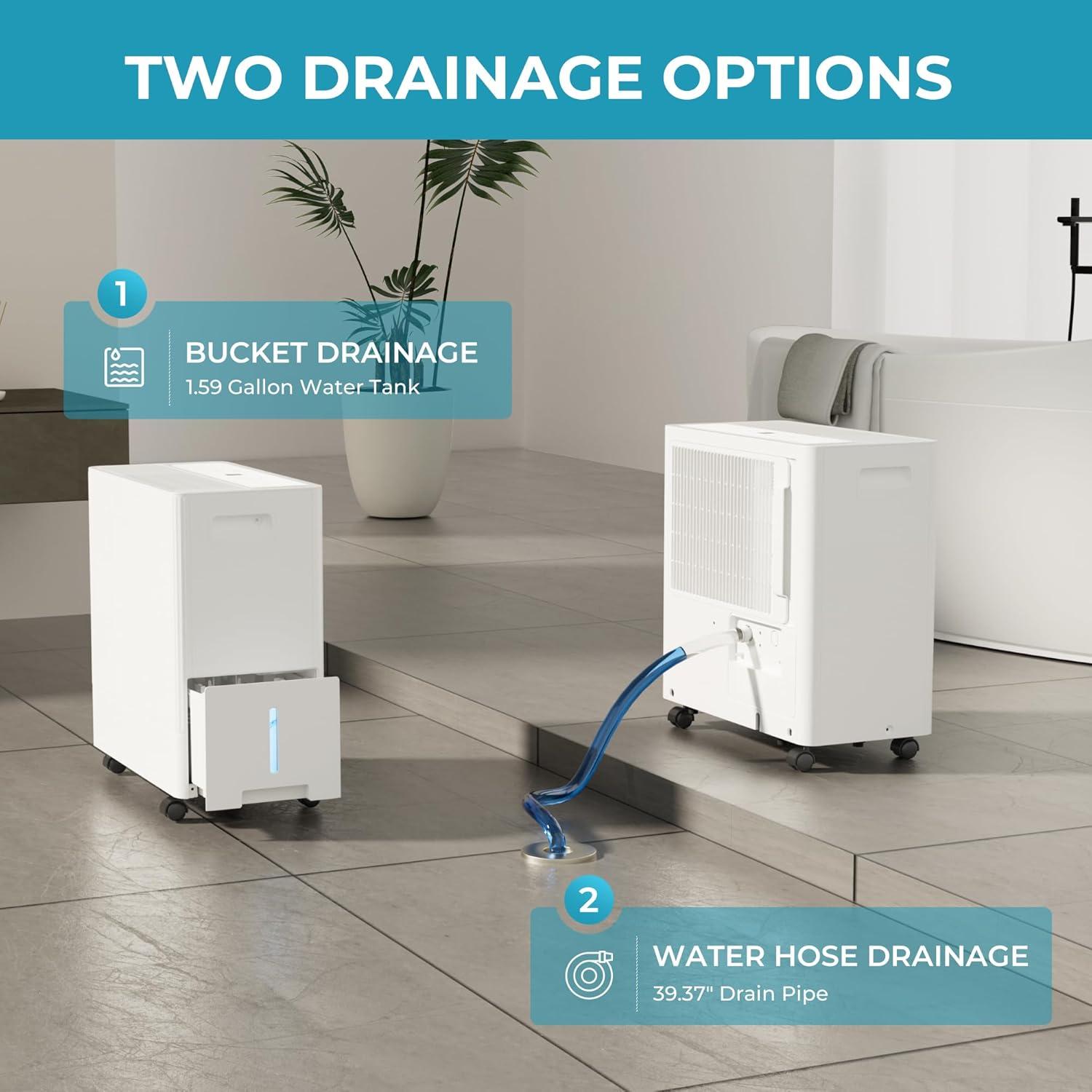 【Two Drainage Options】You can keep your room dry and comfortable by selecting bucket drainage or water hose drainage, depending on your needs. Our basement dehumidifier comes with a 39.37″ drain hose,in water hose drainage, you can drain collected water continuously through the drain hose. At the same time, our dehumidifier has a water tank with a capacity of up to 0.85 gallons/3.2 liters . When the maximum capacity is reached, the unit will automatically stop and the indicator light will light up to remind you to empty the water tank.