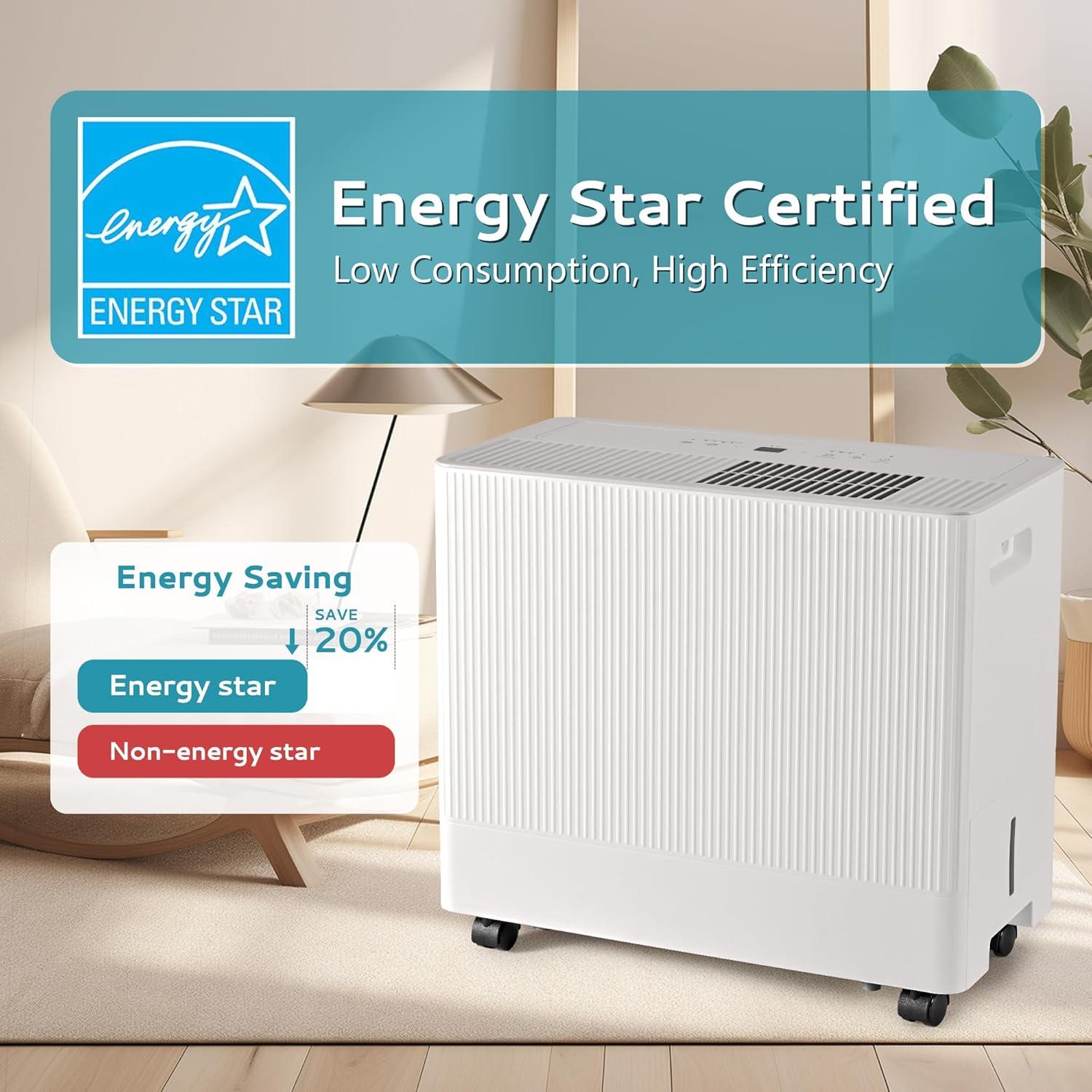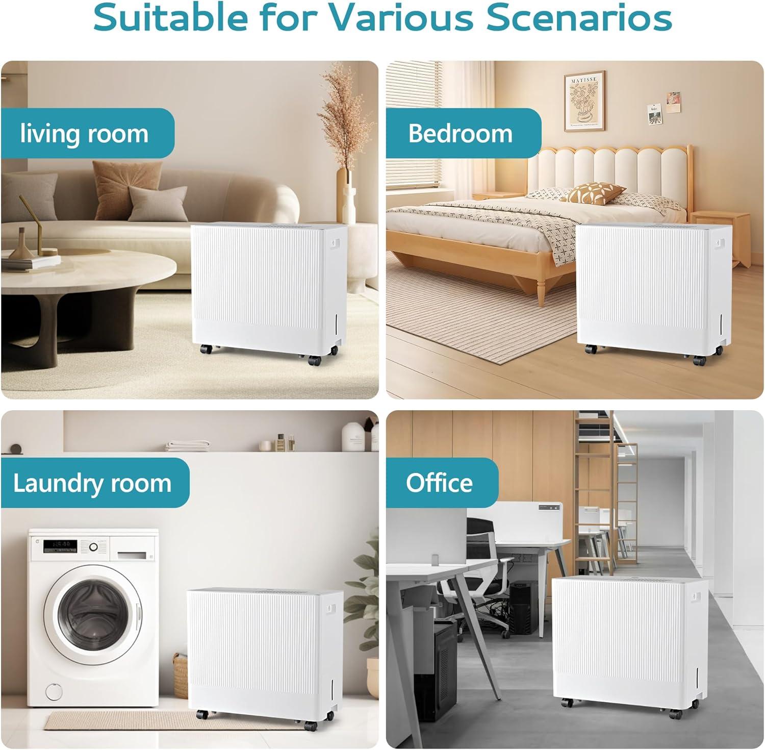 【Powerful dehumidifier for Space Up to 1500 Sq.Ft】Our dehumidifiers for basement can remove up to 22 pints of moisture per day from the air under ENERGY STAR certification, up to 34 pints per day under the 2019 DOE standard, and up to 55 pints per day at 86°F/80,covers up 1500 Sq.Ft.It is a large dehumidifier suitable for basements, offices, homes, bathrooms, bedrooms, kitchens, storage rooms, living rooms, laundry rooms, cellars, etc.