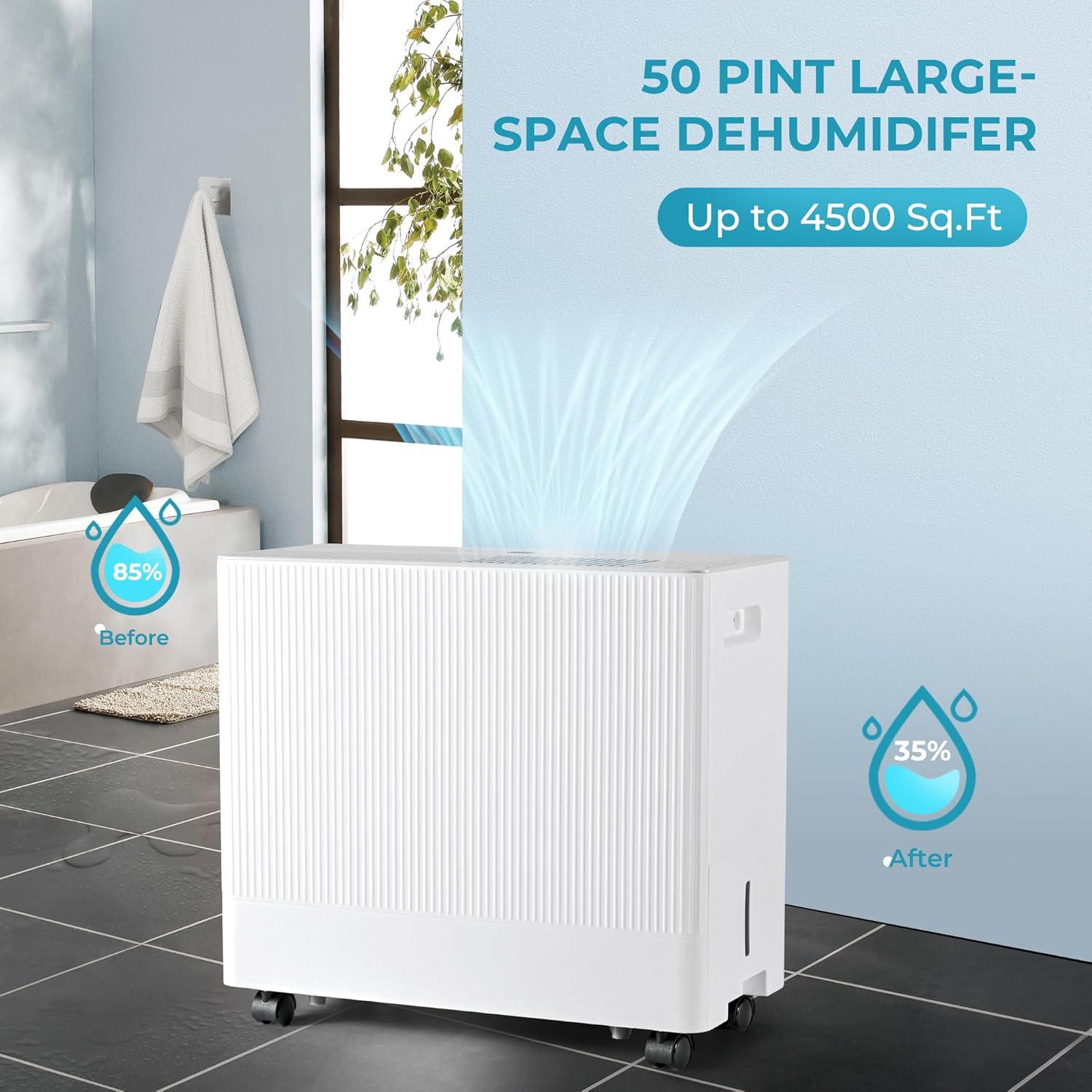 Euhomy 1500 Sq.Ft Energy Star Dehumidifier for Basement, 22 Pint to 55 Pint Dehumidifier with 0.85 Gallon Water Tank Capacity, Auto Drainage,Large Dehumidifiers For Home with 4 Operation Modes(50Pints-HT)