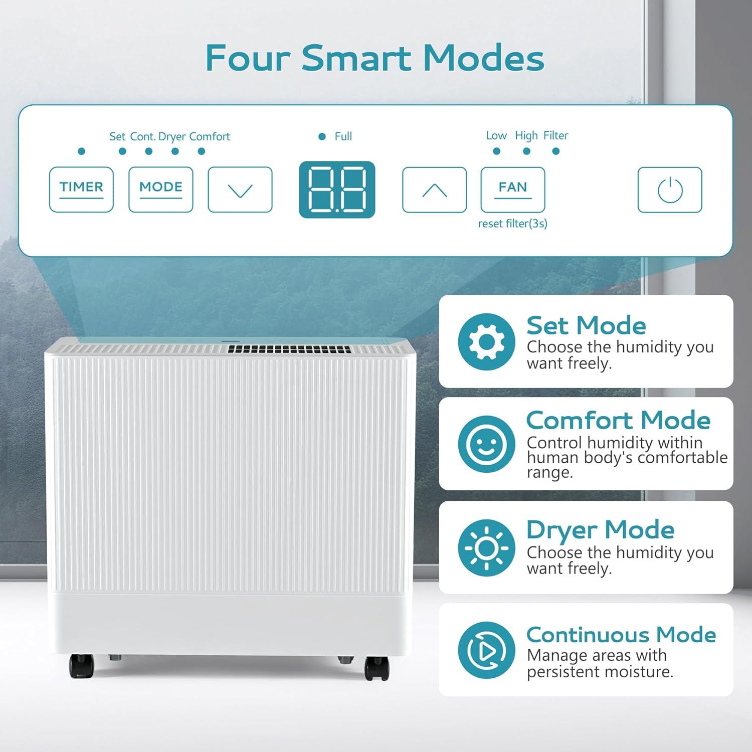 【Four Smart Modes】Our large dehumidifier for basement has 4 smart modes. You can easily switch between SET, COMFORT, DRYER and CONT modes with the control panel.In SET mode, you can adjust the humidity range from 35% to 80%.; COMFORT mode will intelligently keep the space humidity within the human body's comfortable range; wet delicate clothes can be quickly dried with the help of DRYER mode. Additionally, CONT. mode is ideal for managing areas with constant moisture.