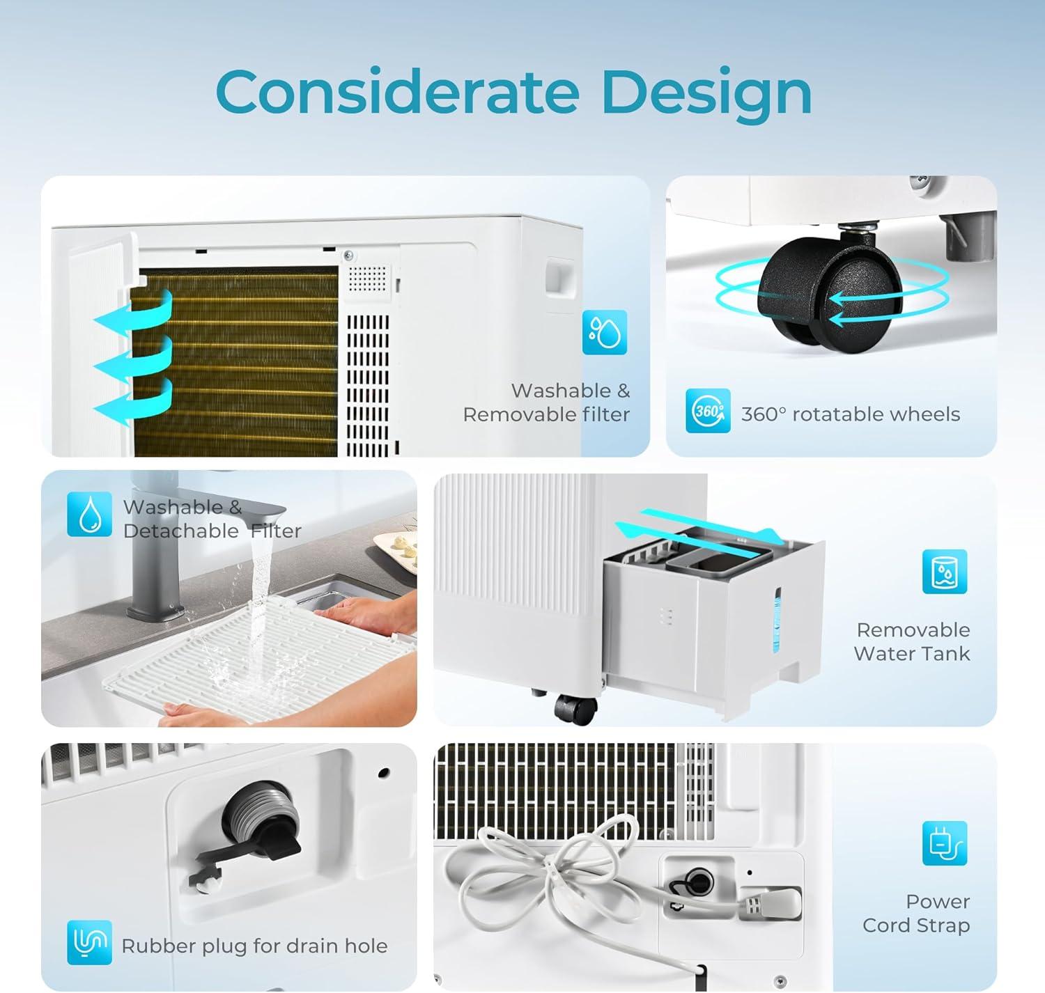 【Easy to Move & User-Friendly Design】The home dehumidifier has handles on the side and wheels on the bottom, so it can be easily moved to various places. The washable filter is easy to remove and can be easily installed, we recommend you to clean it once a month. And we also provide an adjustable strap that can store plug cords, no need to worry about plug cords nowhere to place.