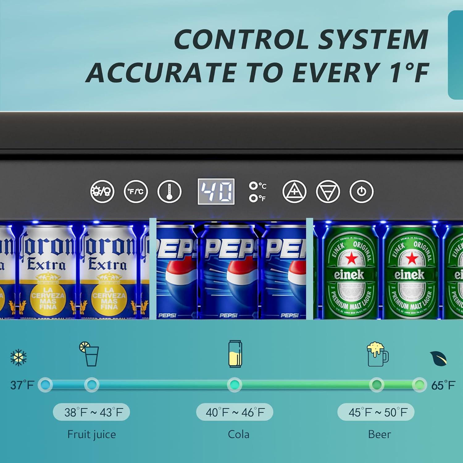 Large Capacity & Mobile Shelf – This beverage refrigerator provides beverage enthusiasts with more spacious storage for up to 180 standard-sized cans. The beverage cooler includes 3 pull-out shelves that can be adjusted at will to space each tier on 5 fixed slots. The under counter refrigerator is equipped with a highly sensitive sensor that is adjustable from 37-65°F, and the temperature range will not exceed 3.6°F, so the drinks are at their best whenever you serve them