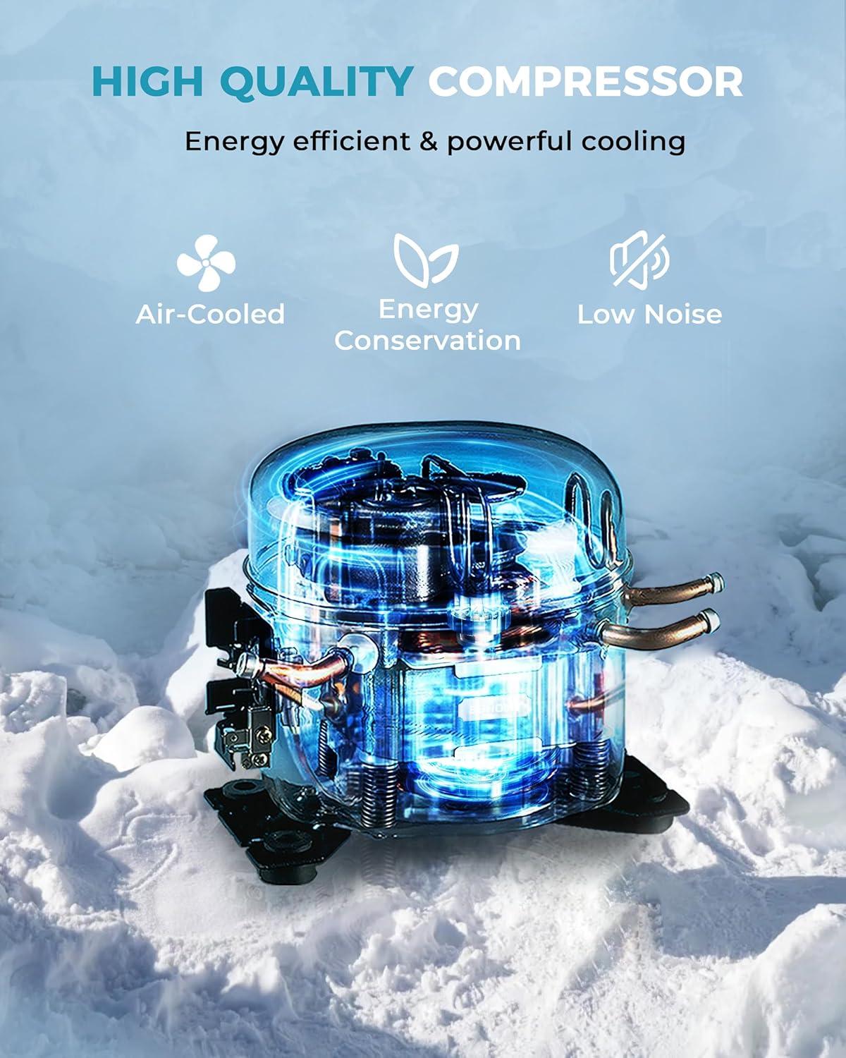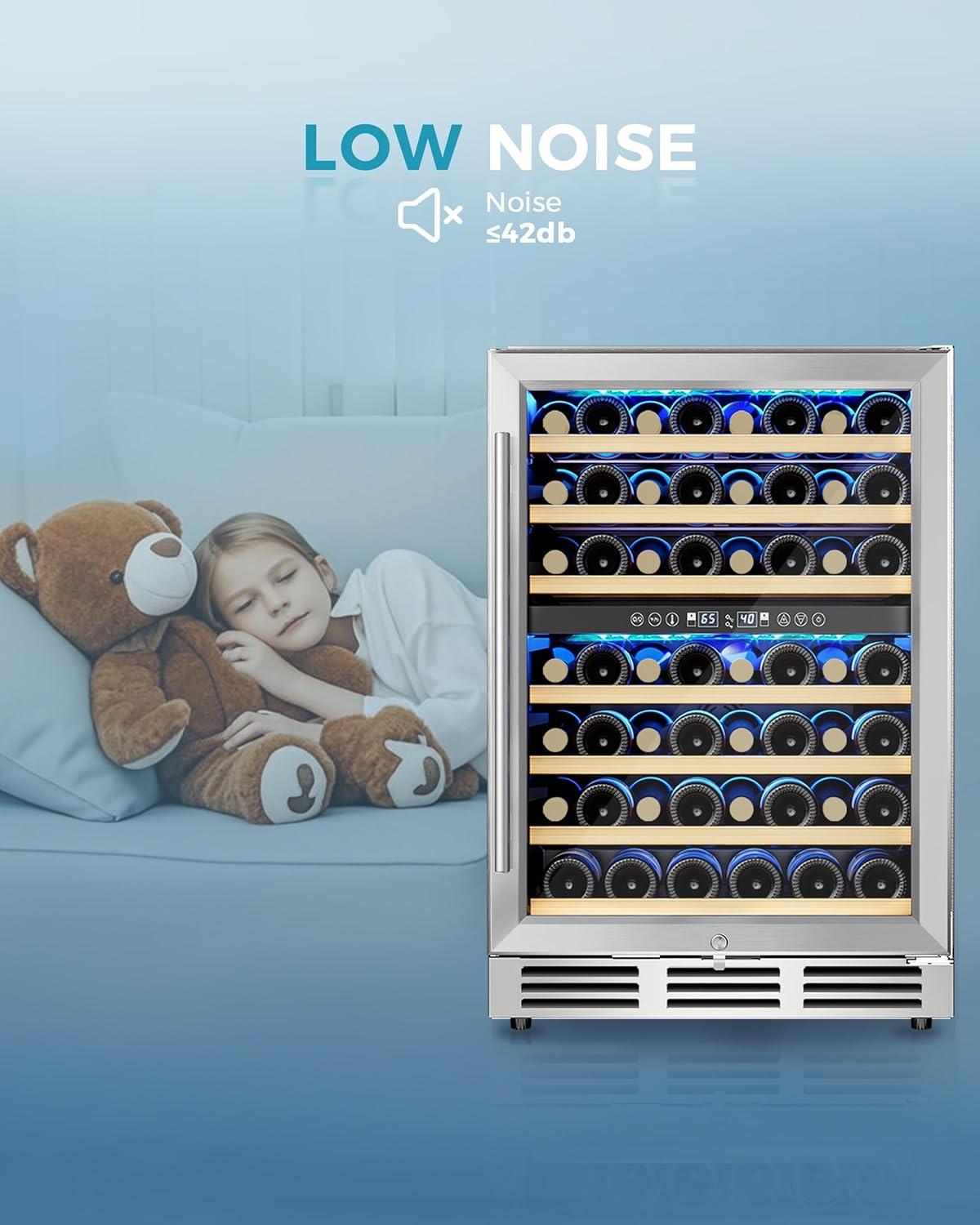 【High efficiency silent compressor】This wine cooler refrigerator is powered by a high-performance, ultra-quiet compressor (<38dB), delivering fast, stable cooling without disrupting your daily life. The wine chiller ensures your wines age flawlessly in a peaceful, temperature-controlled environment.
