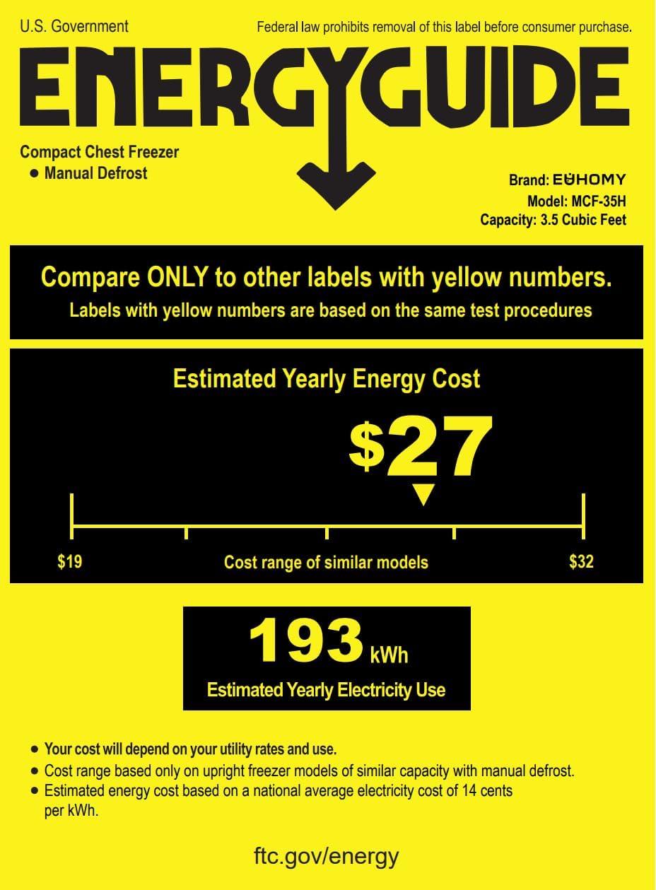 COMBINE CAPACITY AND SIZE – Euhomy freezer requires only a small footprint of 3.2 ft² and fits into the corner of most kitchens, apartments, dining rooms, garages. The compact size: 21.2″(W) x 21.6″(D) x 31″(H) allows the deep freezer to fit cabinets, and the large internal capacity of 3.5 cuft can hold about 33lbs of beef and 48lbs of fish, enough to meet daily needs