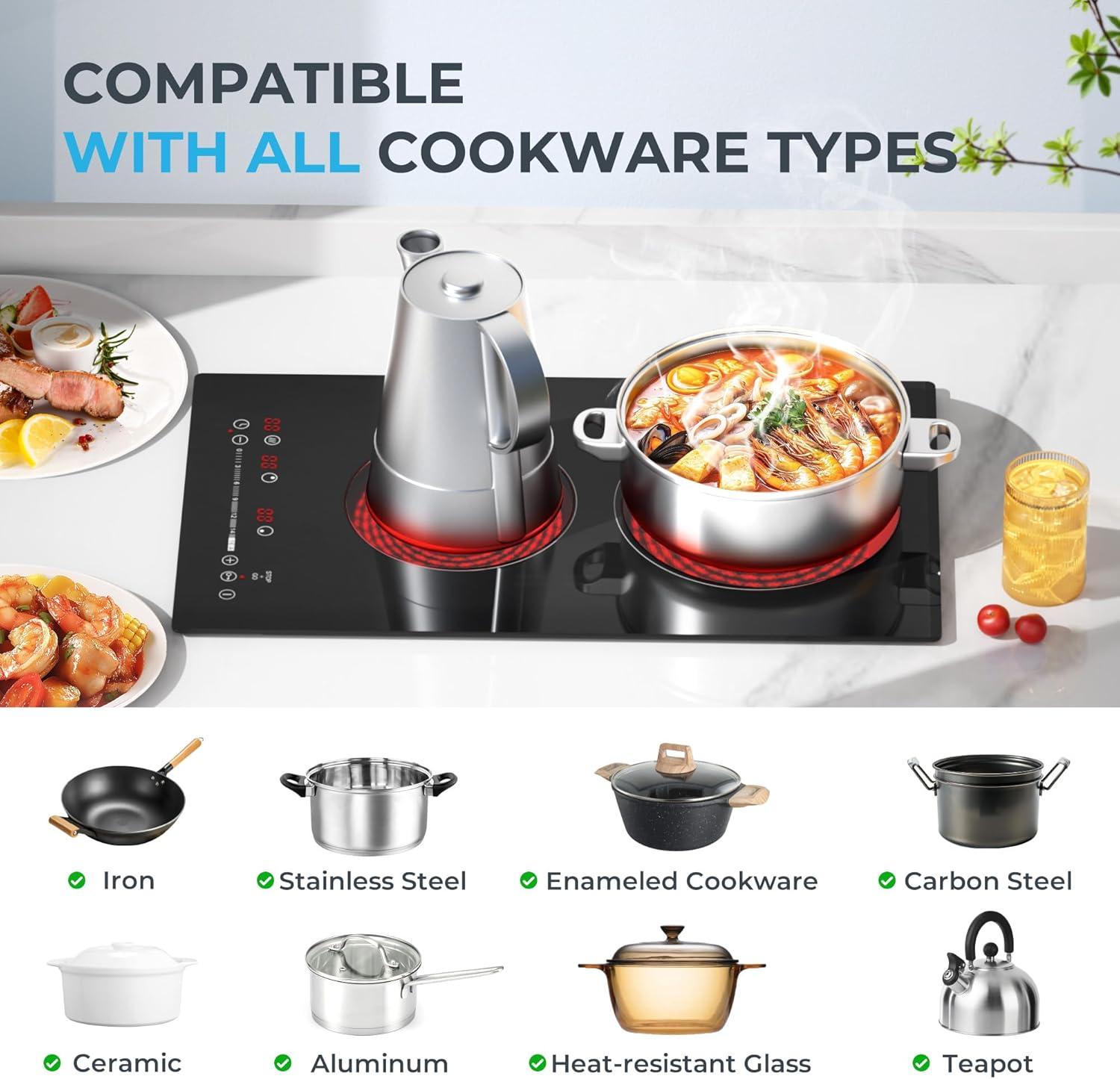 𝐅𝐨𝐮𝐫 𝐇𝐞𝐚𝐭𝐢𝐧𝐠 𝐙𝐨𝐧𝐞𝐬 𝐰𝐢𝐭𝐡 𝐏𝐨𝐰𝐞𝐫𝐟𝐮𝐥 𝟔𝟎𝟎𝟎𝐖 𝐎𝐮𝐭𝐩𝐮𝐭: This advanced electric ceramic cooktop is equipped with four independent heating zones, with power outputs of 1200W, 1200W, 1800W, and 1800W respectively, offering flexibility for various culinary needs. Designed to operate on 220-240V voltage, this built-in model requires direct wiring. This cooktop delivers consistent heat and reliable performance. 𝐓𝐞𝐬𝐭 𝐫𝐞𝐬𝐮𝐥𝐭𝐬 𝐬𝐡𝐨𝐰 𝐭𝐡𝐚𝐭 𝐭𝐡𝐞 𝟏𝟖𝟎𝟎𝐖 𝐡𝐞𝐚𝐭𝐢𝐧𝐠 𝐳𝐨𝐧𝐞 𝐜𝐚𝐧 𝐛𝐨𝐢𝐥 𝟎.𝟏𝟑 𝐠𝐚𝐥𝐥𝐨𝐧𝐬 (𝟓𝟎𝟎𝐦𝐥) 𝐨𝐟 𝐰𝐚𝐭𝐞𝐫 𝐟𝐫𝐨𝐦 𝟐𝟓°𝐂 𝐢𝐧 𝟕 𝐦𝐢𝐧𝐮𝐭𝐞𝐬 𝐰𝐡𝐢𝐥𝐞 𝐭𝐡𝐞 𝟏𝟐𝟎𝟎𝐖 𝐳𝐨𝐧𝐞 𝐭𝐚𝐤𝐞𝐬 𝟗 𝐦𝐢𝐧𝐮𝐭𝐞𝐬