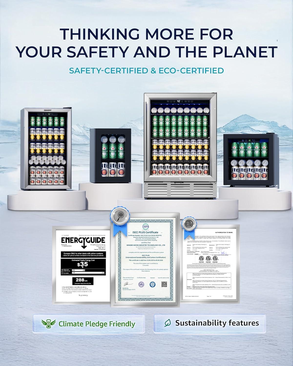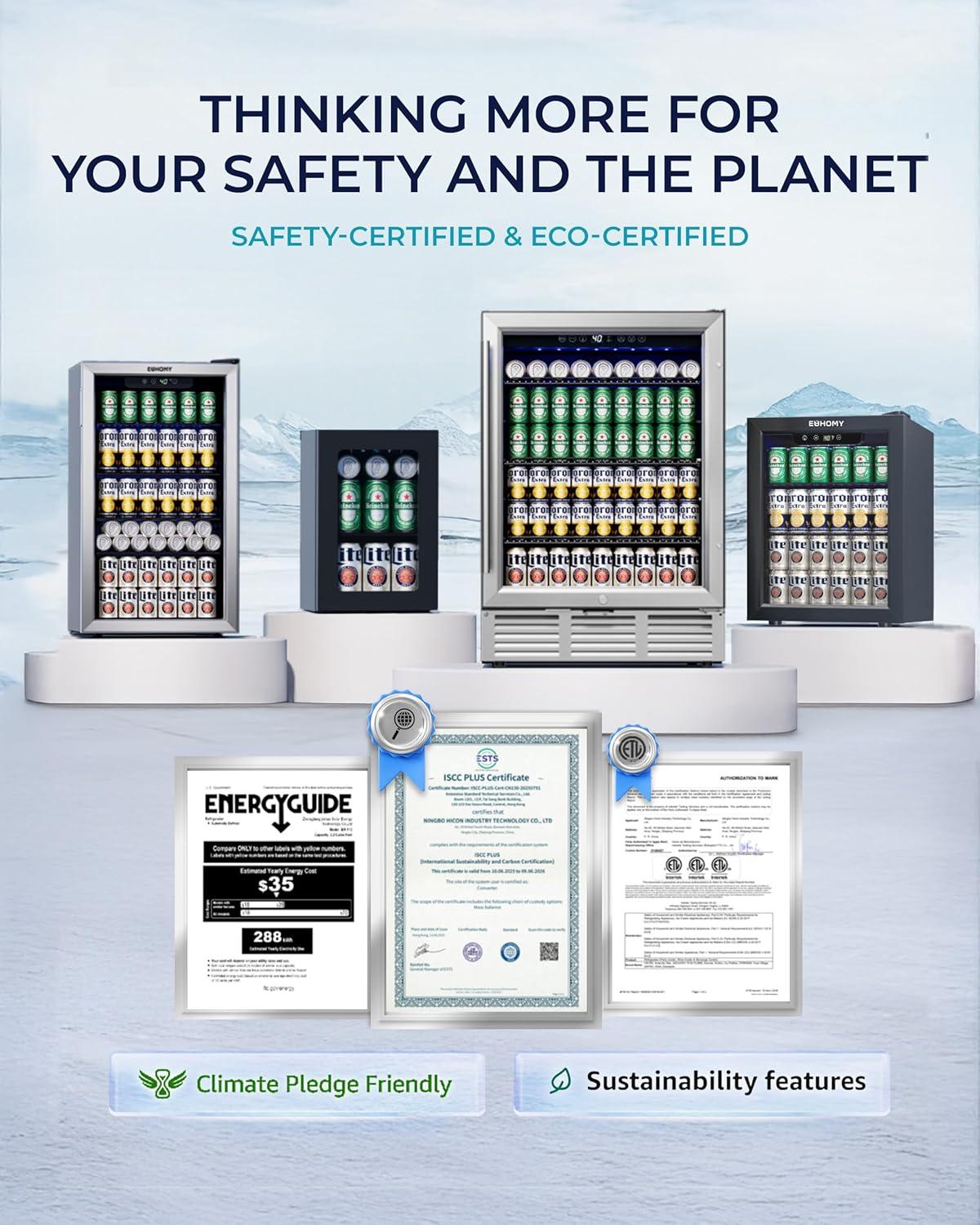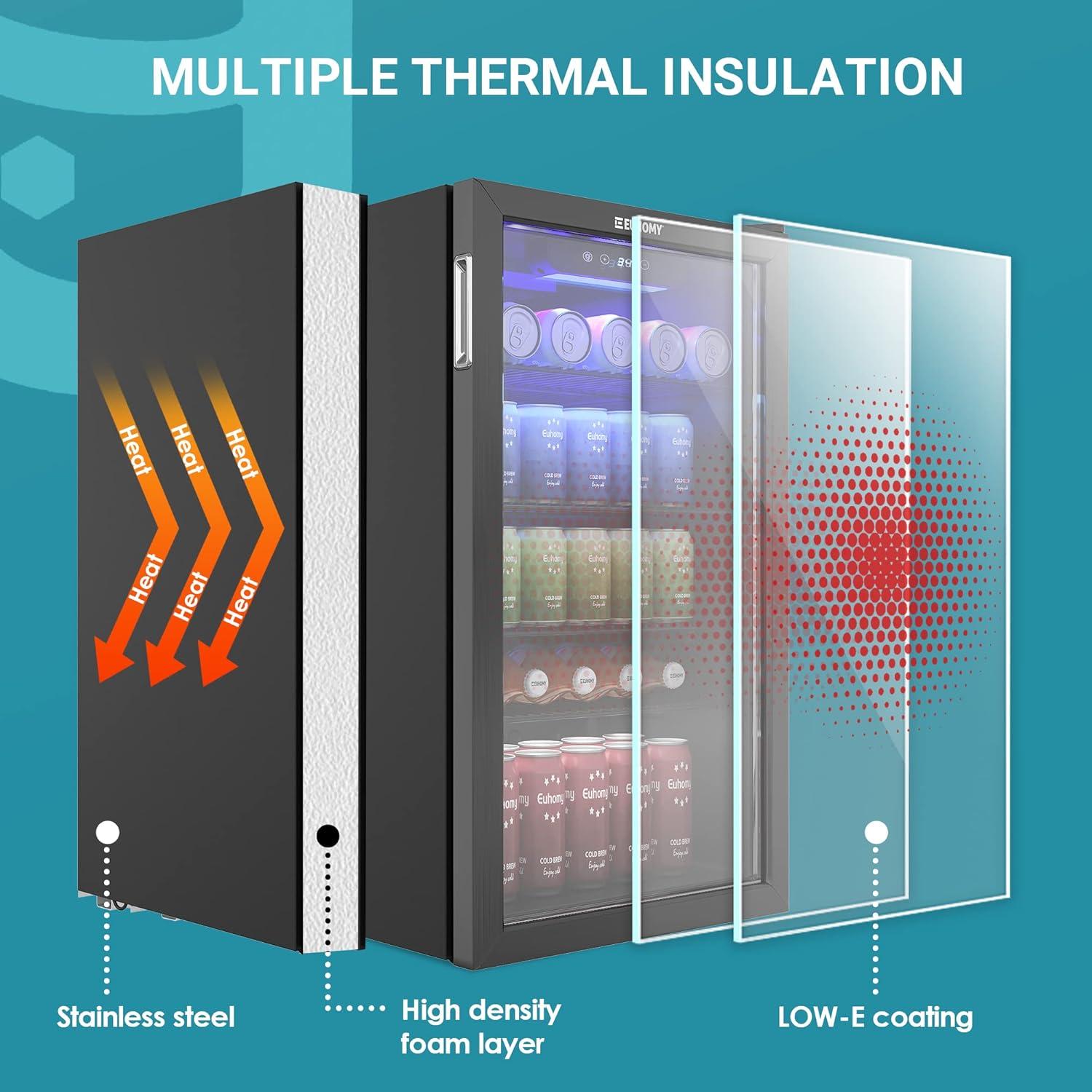 lNTELLIGENT CONTROL – Euhomy Beer and Wine Chiller offers a variable temperature selection ranging from (32°F to 61°F) to meet your multiple storage options. The digital display allows you to easily monitor and set whatever temperature you need. Unlike most beverage coolers, Euhomy’s beverage cooler use air-cooled frost-free technology, so all you have to do is enjoy your beverages
