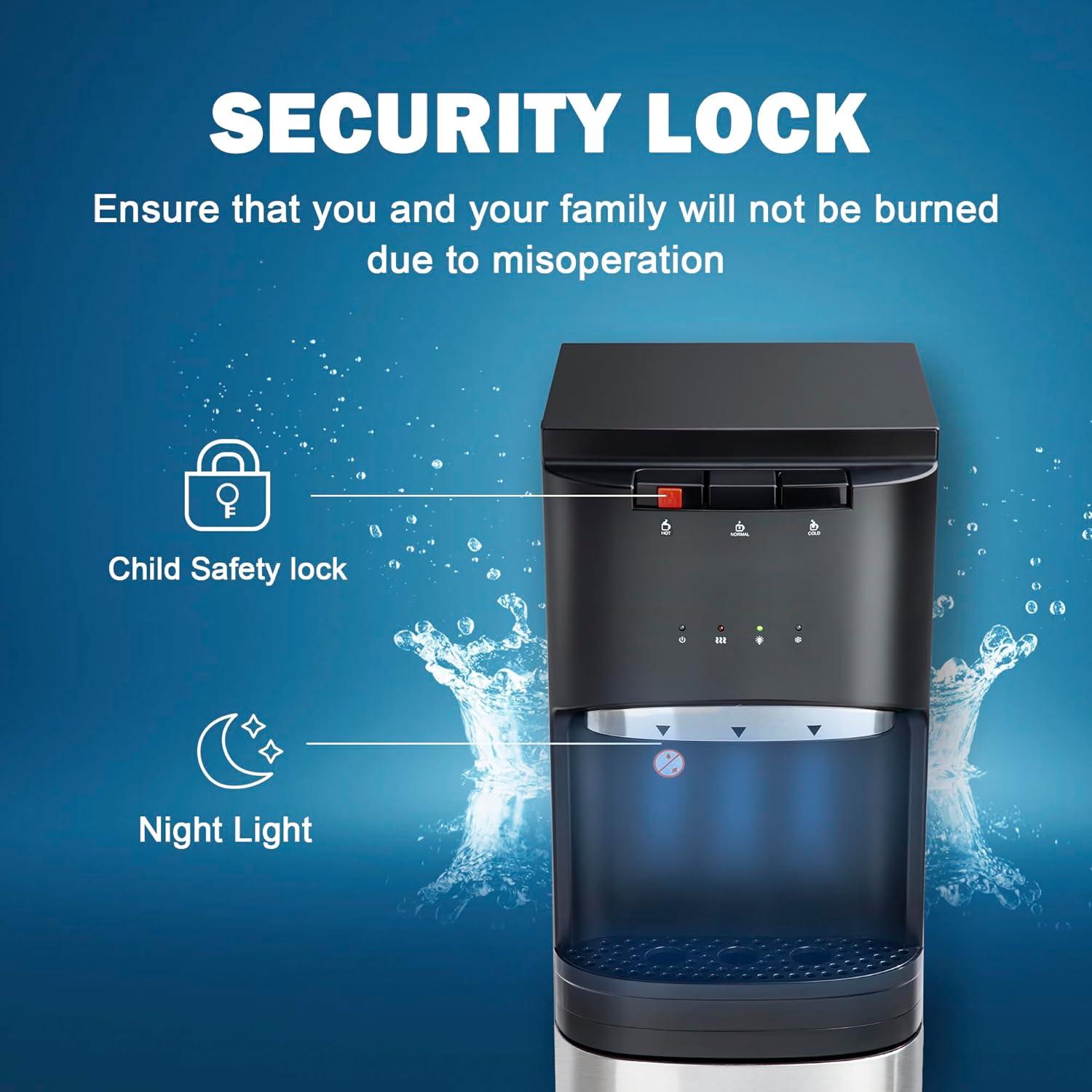 Modern Design: This water cooler dispenser for 5 gallon bottle features a beautiful, stylish, modern exterior design that easily blends into any environment, whether it's an apartment, school, or business. This cold water dispenser you to enjoy convenient hydration without sacrificing valuable countertop or floor space.