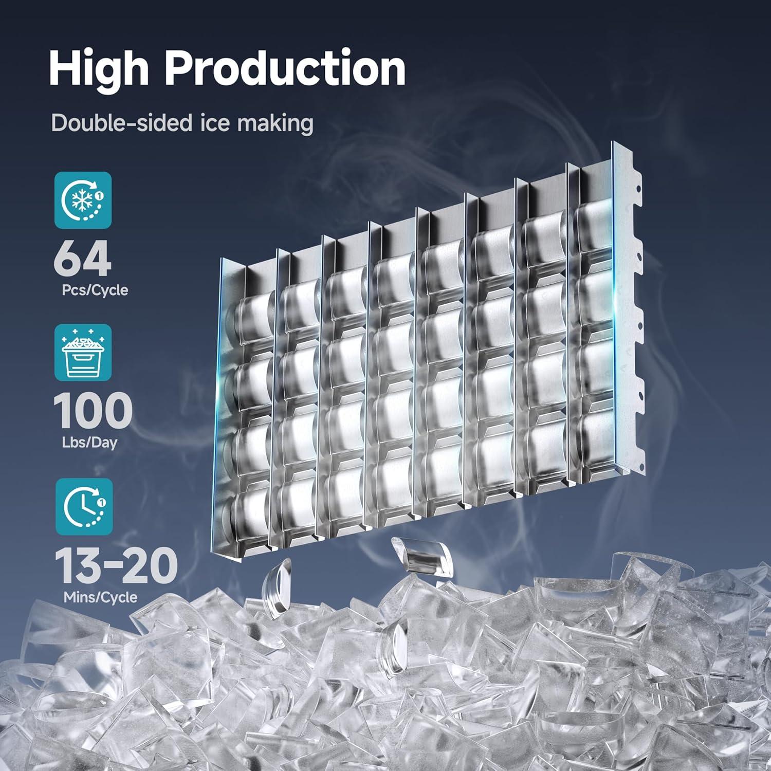 EUHOMY Commercial Ice Maker Machine, 100lbs/24H Stainless Steel Under Counter ice Machine with 33lbs Ice Storage Capacity, Freestanding Ice Maker.(100lbs/24H/Crescent Ice)