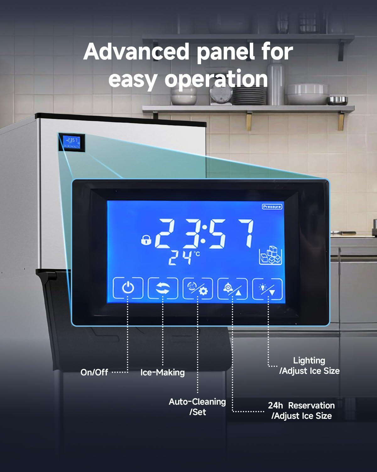 Easy Use Control Panel – Take full control of your ice production with our commercial ice machine’s easy-to-use control panel. The smart LCD panel offers a range of functions, including 1-24 hour timing, full ice reminder, water shortage reminder, and self-cleaning. Adjust ice cube size effortlessly with the (+) or (-) buttons. Streamline operations and meet customer demands with ultimate convenience.