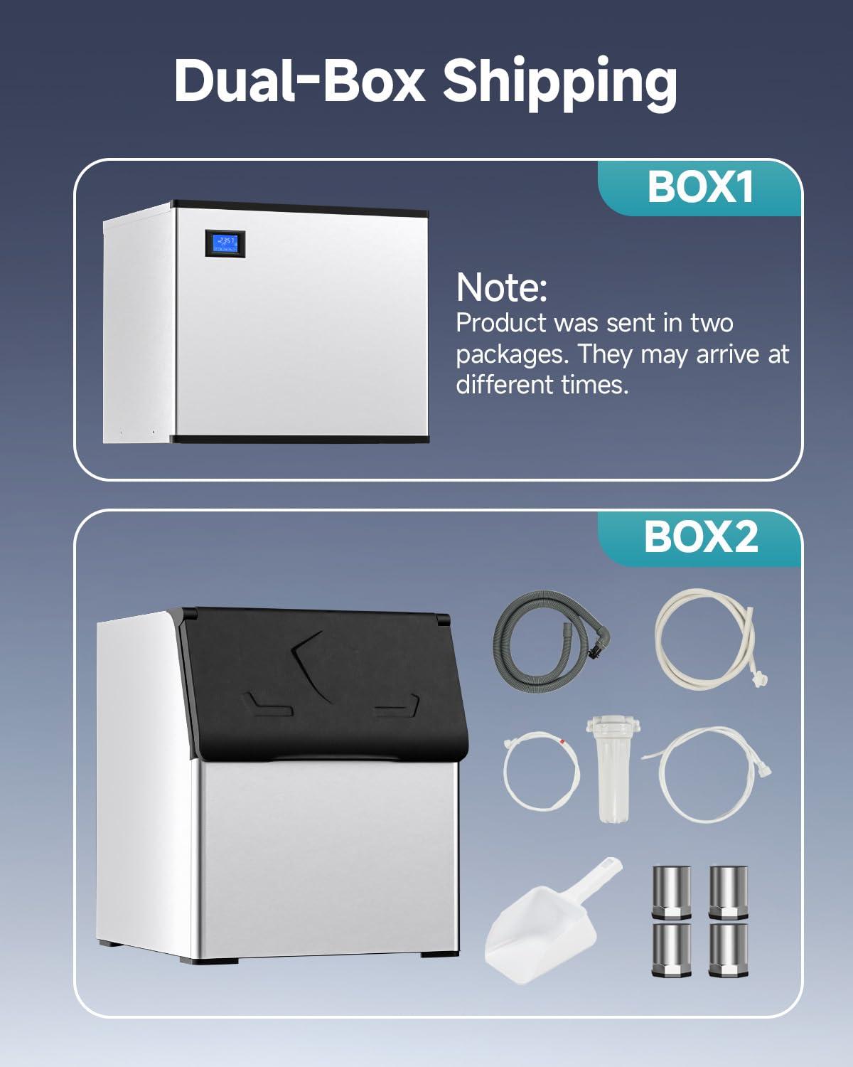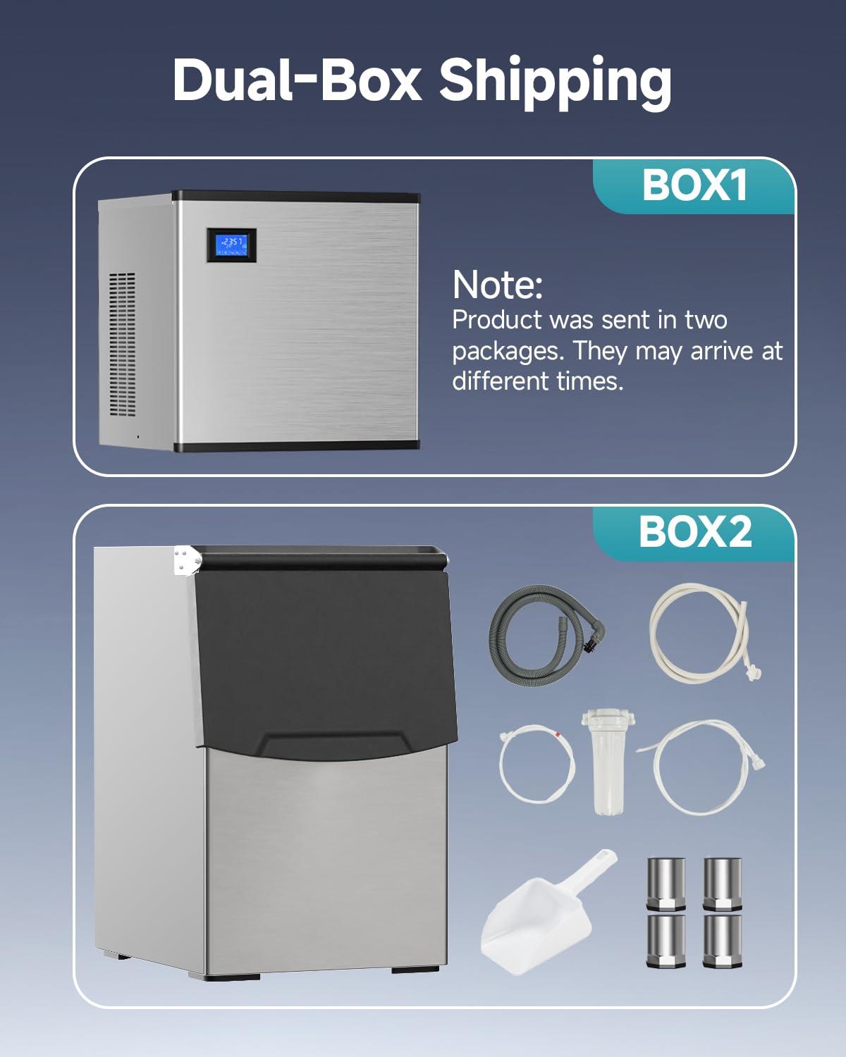 Dual-box shipping: Please note that the two boxes may arrive at different times during transportation. If you have any question while using the commercial ice maker, please let us konw promptly, We're always here for you whenever you need assistance.