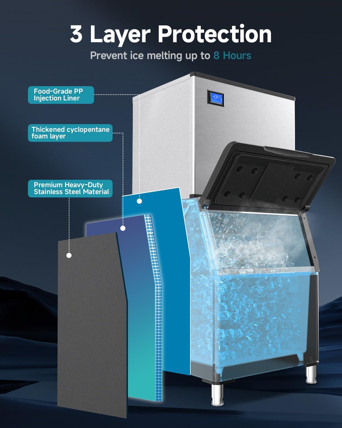 Durable, Reliable & Insulated – The ice maker commercial is constructed with high-quality materials and advanced manufacturing processes, ensuring its durability and reliability. Additionally, it incorporates insulation technology that helps maintain the temperature of the ice, keeping it frozen for longer periods. This ensures that your ice remains solid and doesn't melt quickly, providing a reliable supply of ice for your business.