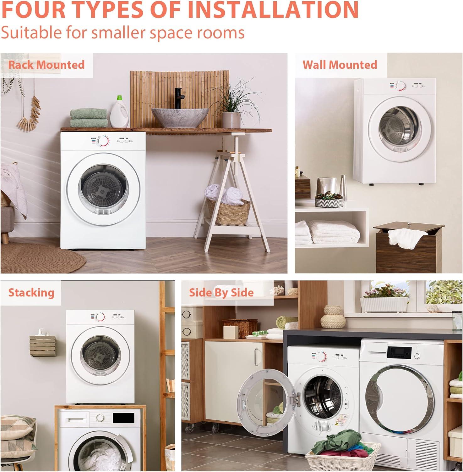 【User Friendly Design】This apartment size dryer for clothes contains 1 dryer, 2 plastic spacers, 2 hanging brackets, 1 exhaust fitting, 1 exhaust pipe, 4 screws 12mm long, 4 screws 25mm long, and an instruction manual.ETL and DOE certifications guarantee the safety and quality of our products. We offer a one-year warranty service.If you have any questions, please feel free to contact us, our professional after-sales team will try their best to solve your problems.