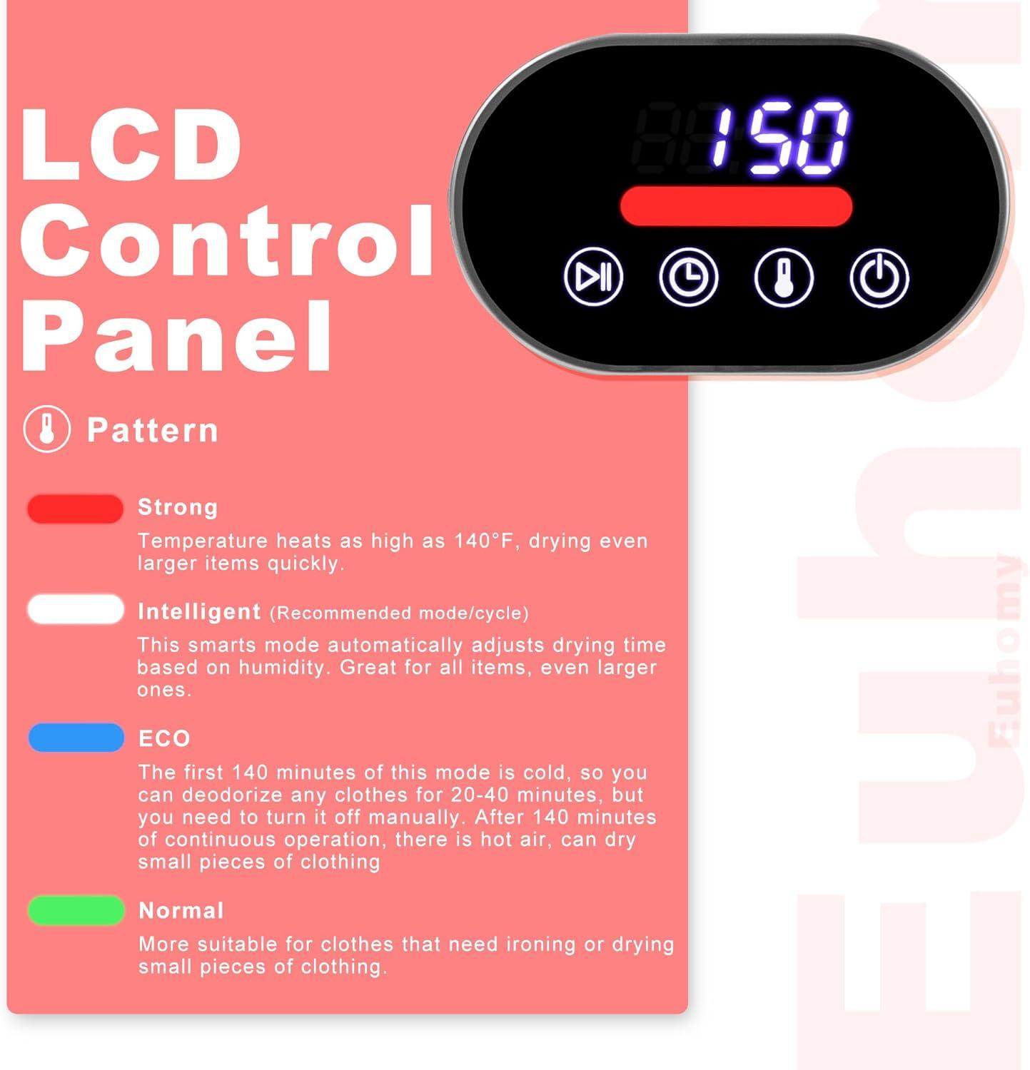 【Multi-function】 Our electric clothes dryer machine features a liquid crystal display (LCD) and has four drying modes: 1.Strong: drying even larger items quickly. 2.Intelligent: This smarts mode automatically adjusts drying time based on humidity. Great for all items, even larger ones. 3.ECO: Deodorize any clothes ,dry small pieces of clothing 4.normal: More suitable for clothes that need ironing or drying small pieces of clothing.