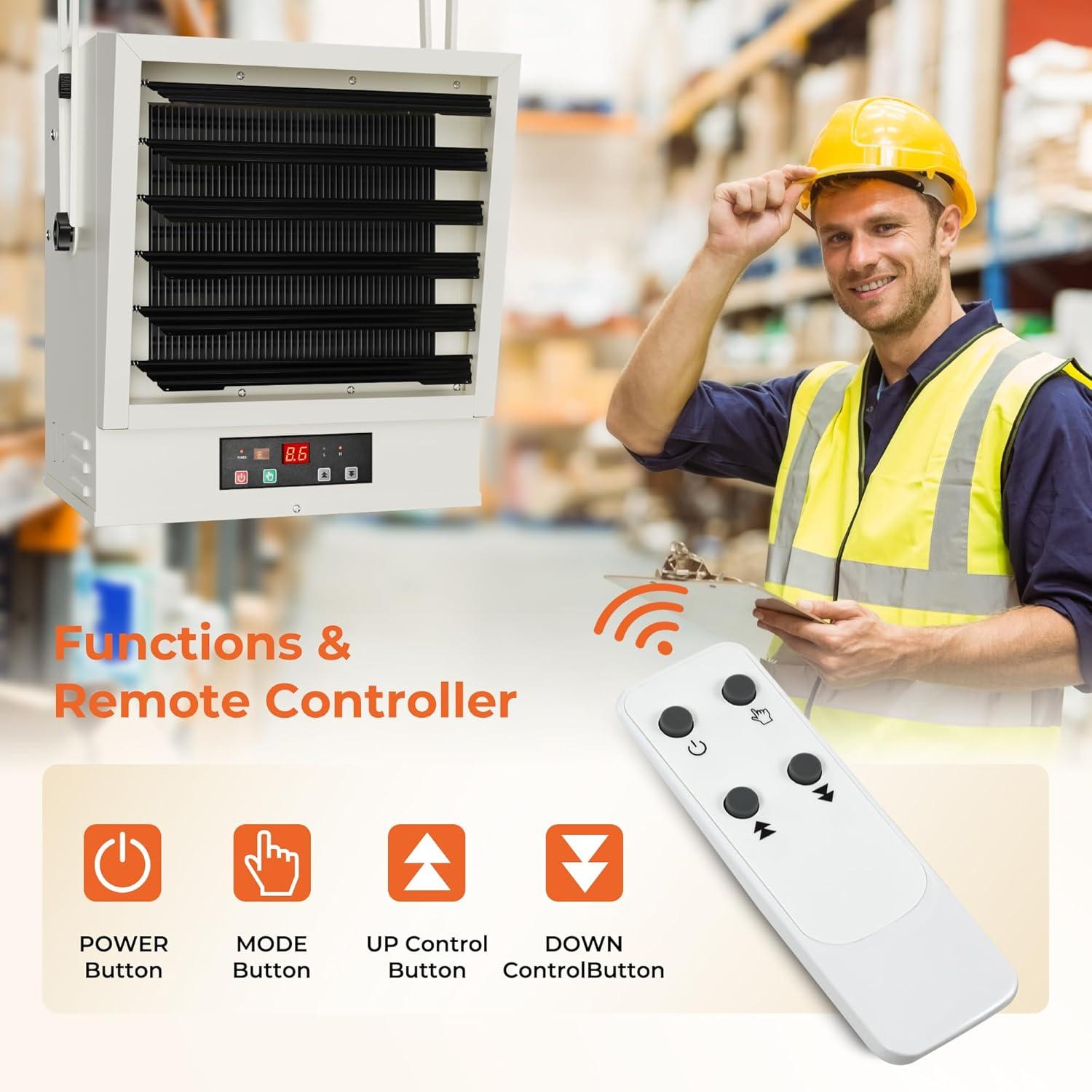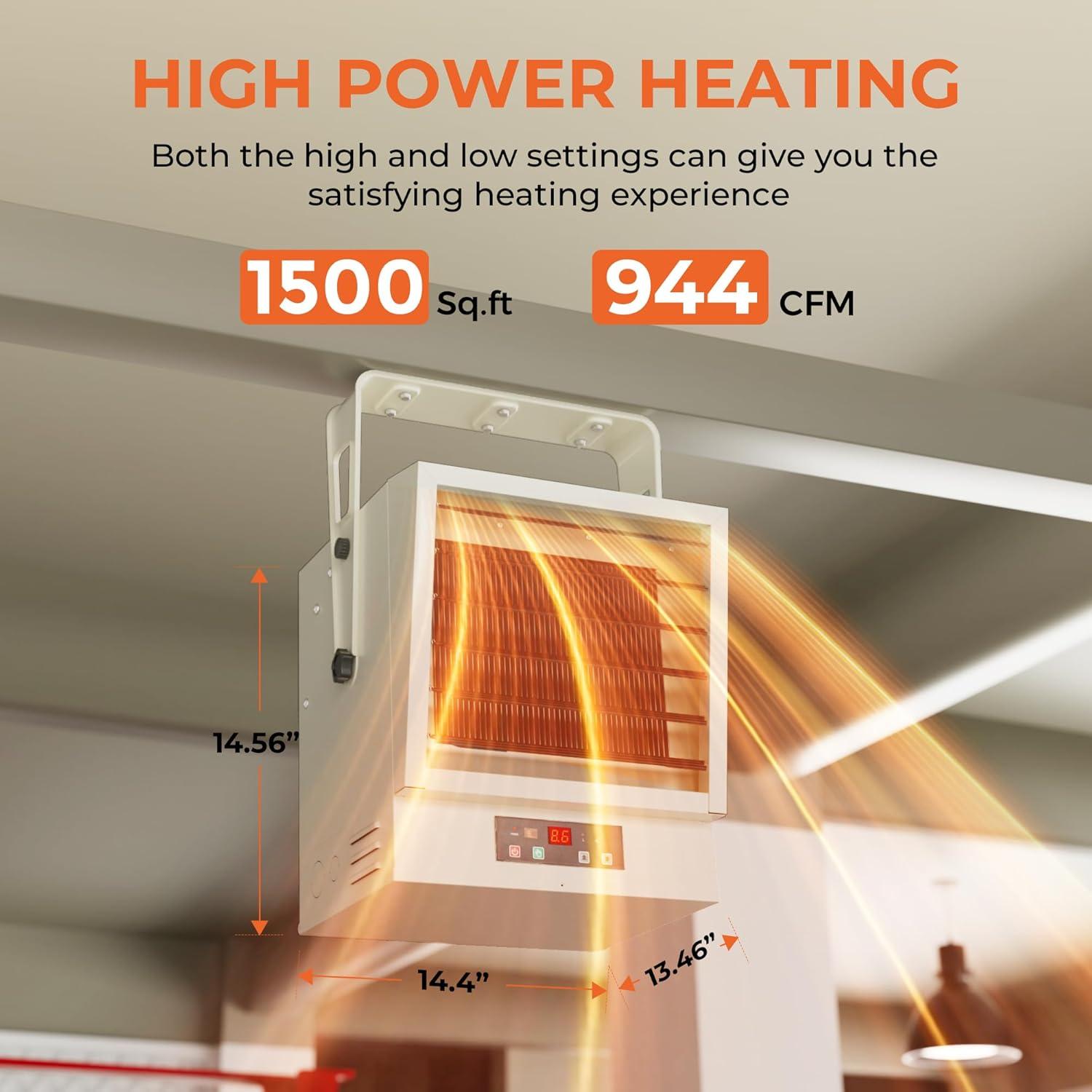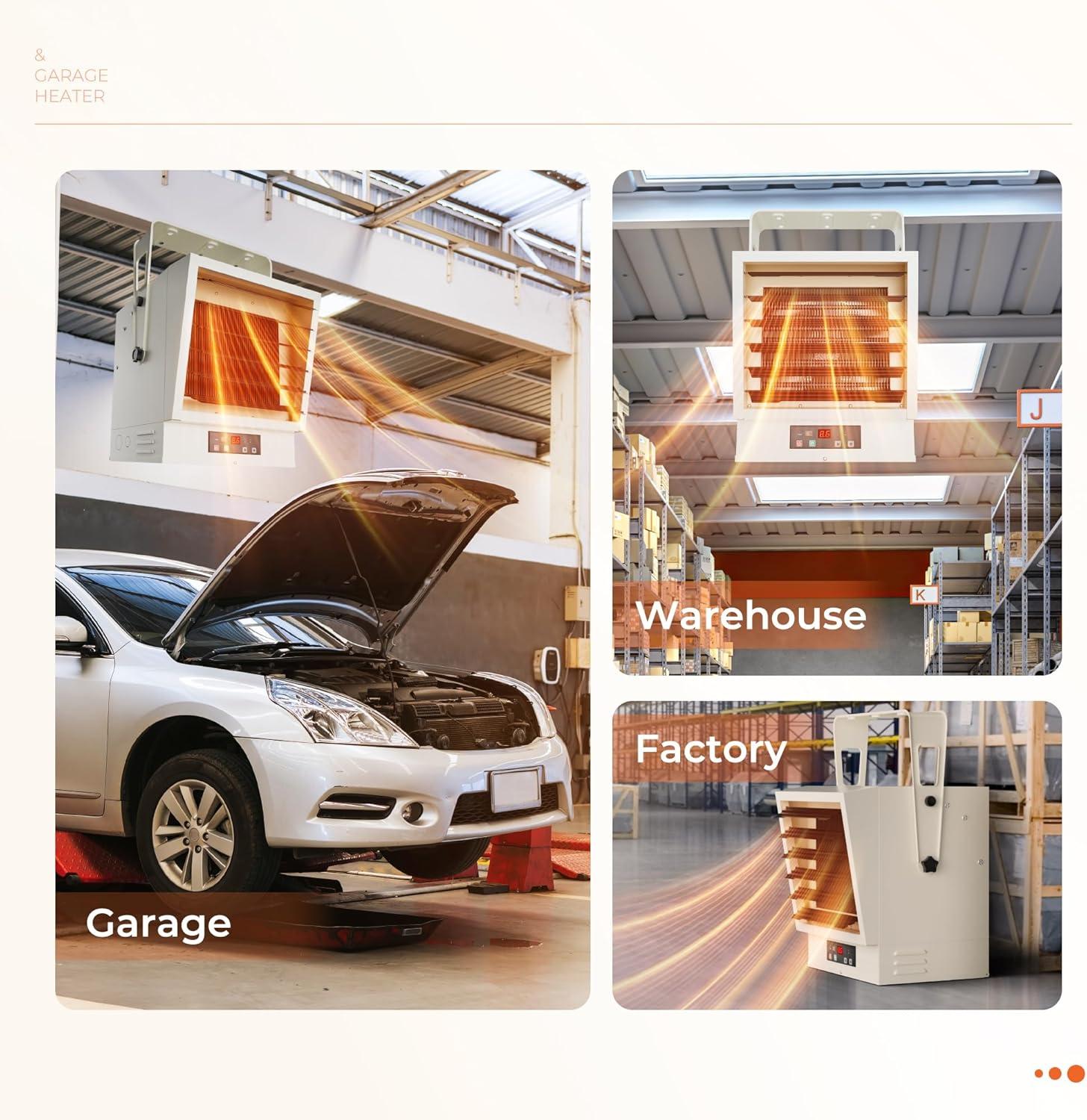 【Sturdy, Durable and Safe】This electric garage heater features heavy-gauge steel construction, resisting moisture, dust, and wear. ETL-certified with overheat protection, it ensures safe and reliable operation in garages, auto shops, and warehouses — regardless of the conditions.