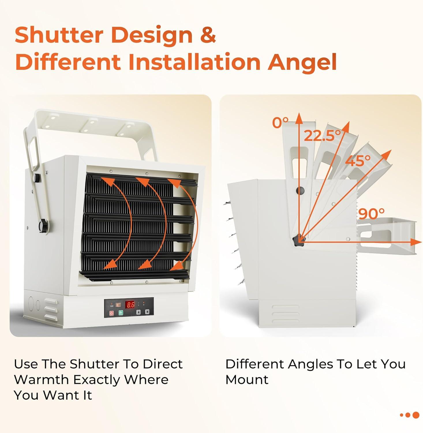 【2 Mounting Methods and Multiple Adjustment Angles】The EUHOMY electric garage heater 240V can be mounted on the ceiling or wall, eliminating floor space. It also features louvered fan angle adjustment and 4 mounting angles(0°, 22.5°, 45°, 90°), allowing you to adjust the angle of the warm air to your needs. We are equipped with a full-function remote control so that you can control the room temperature at any time while you are working or resting.