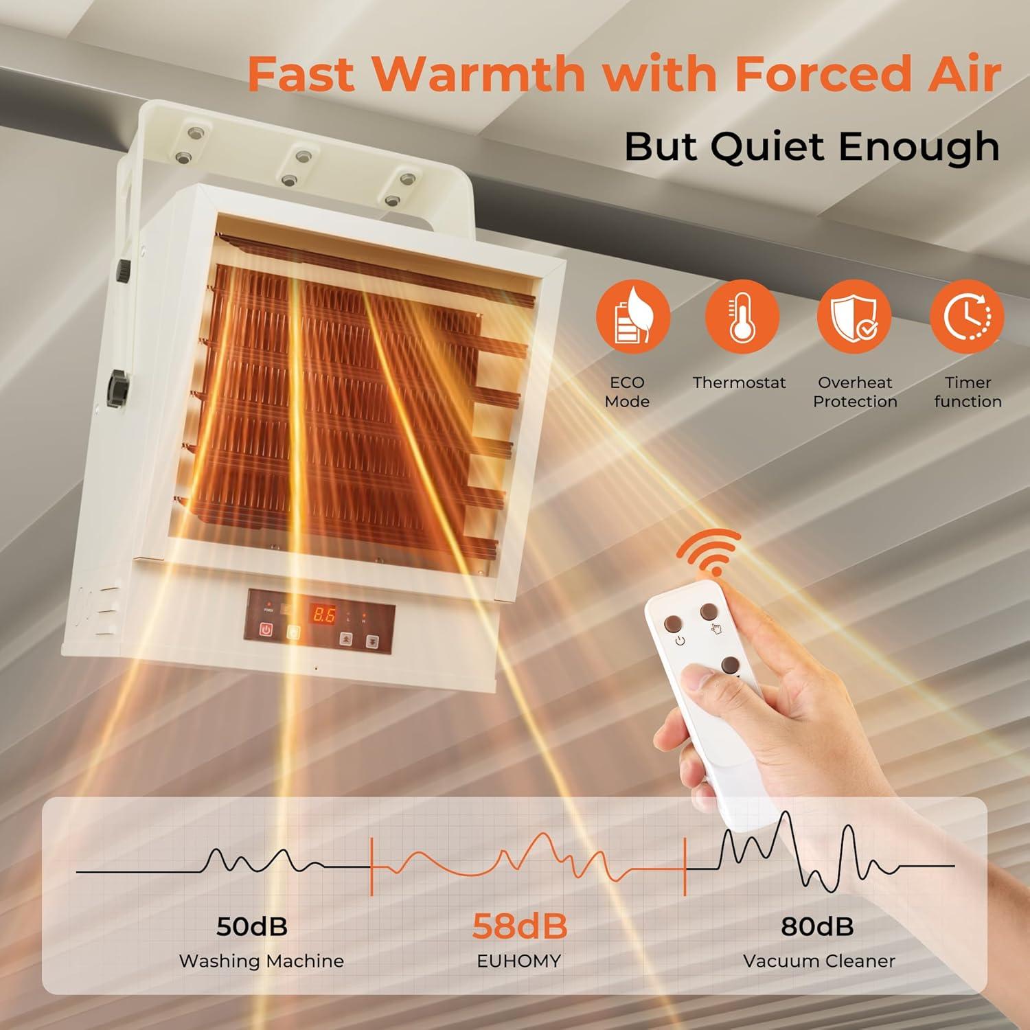【High Performance】EUHOMY Hard-Wired 240V heater ensures stronger, more stable heating and more safety than plug-in models. It has a maximum BTU of 25590 and a power range of 5630-7500 watts, which is enough to heat a large area of up to 1,250 square feet, and customizes your heating needs. Whether it is your garage, workshop, or other large areas, this electric garage heater can handle it with ease, keeping your room warm and comfortable at all times.