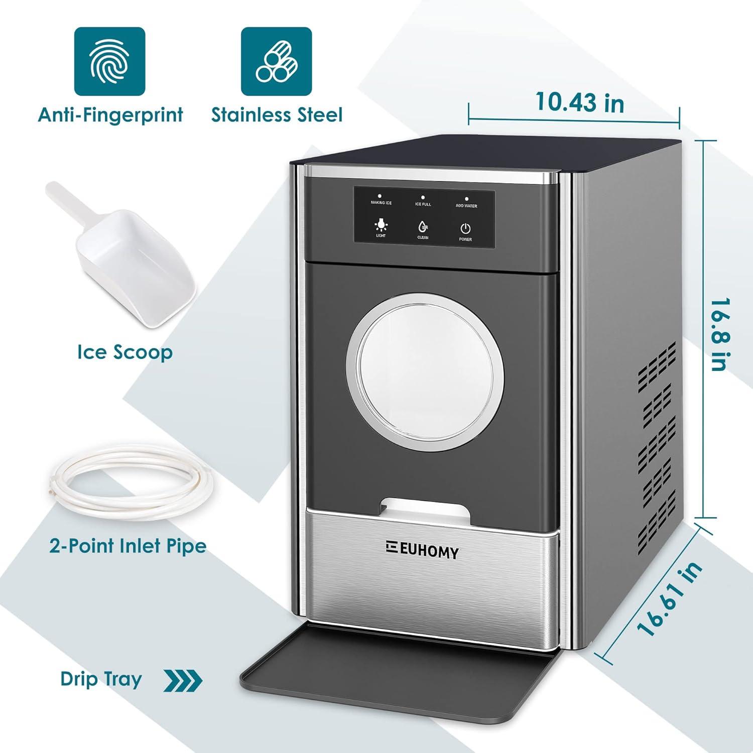 SUPERIOR QUALITY & WARRANTY PROMISE: Include a 2-point inlet pipe, drip tray, ice collecting tray, ice scoop, and manual. Our Mission is committed to providing customers with premium Euhomy ice maker at a reasonable price. We offer ① 12-month warranty from the original purchase date; ② Lifetime technical service support. Suppose you have any questions about using our Ice Makers Countertop, PLEASE reach out to us anytime! Our 7*24-hour customer support is always ready to help you.