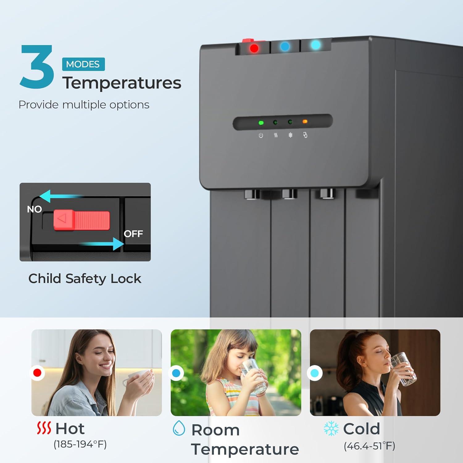 Multi-function: The water cooler dispenser has three modes (hot/warm/cold water), you can choose the required temperature according to your needs.