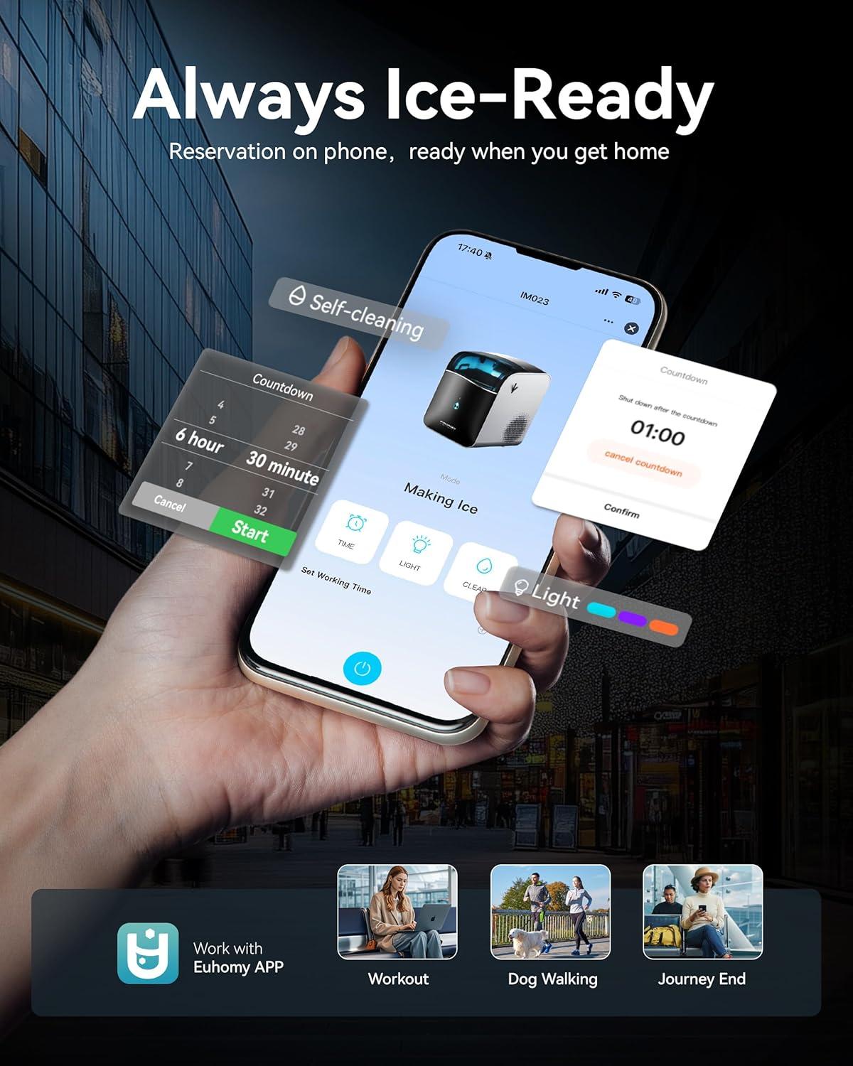 Compact Design & Hanging Ice Scoop: The EUHOMY compact ice maker countertop features a compact footprint (11.8″ x 9.1″ x 13.1″) that fits effortlessly on any countertop or table. Perfect for homes, offices, kitchens, RVs, and more, this portable ice maker machine includes a cleverly designed hanging scoop that's always within reach yet never in the way. The convenient scoop holder keeps your workspace tidy while ensuring easy access to freshly made ice.