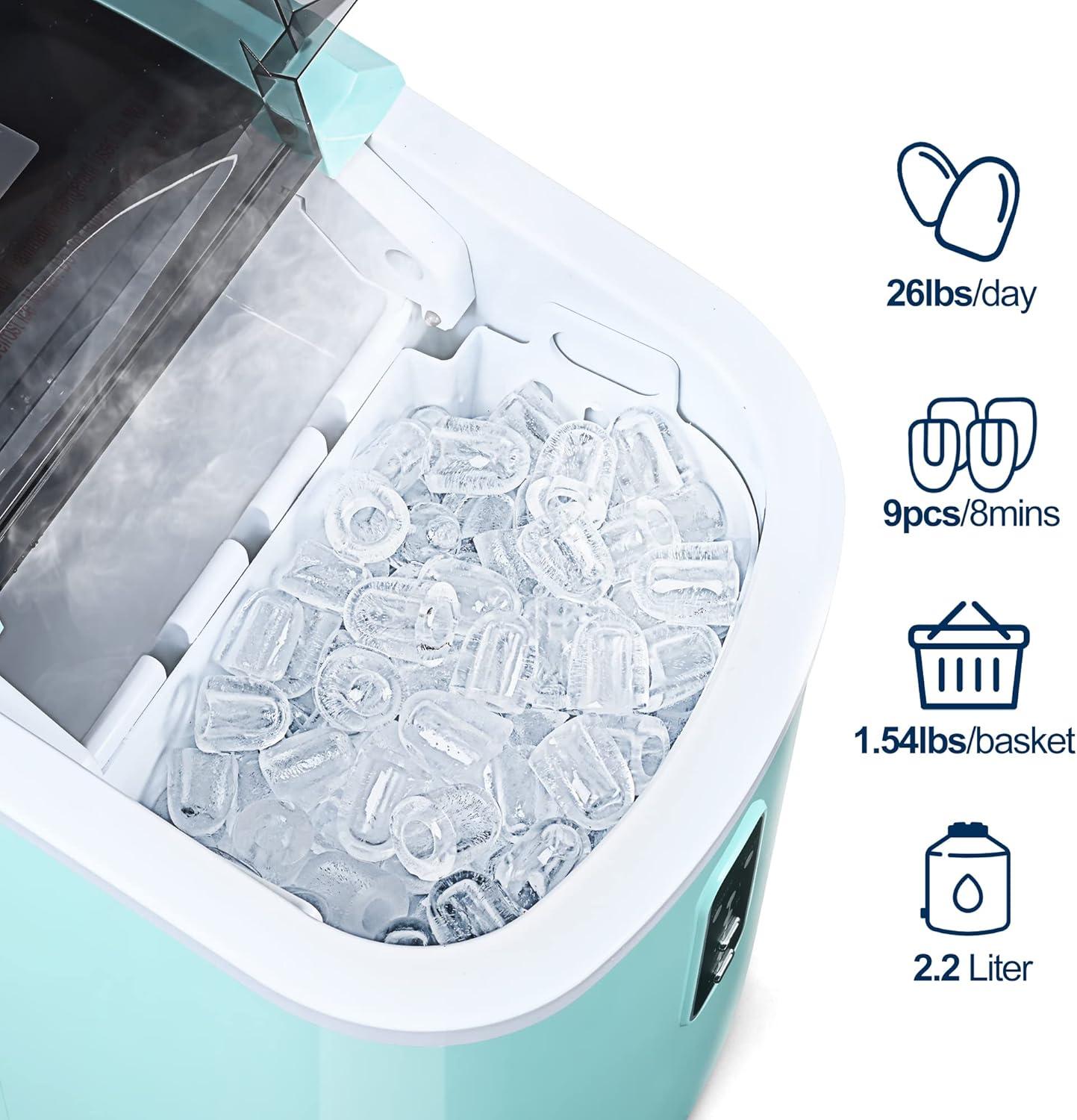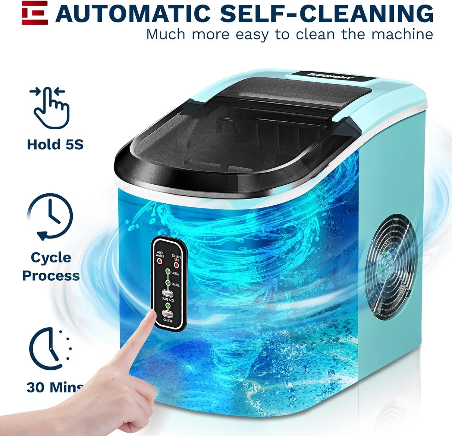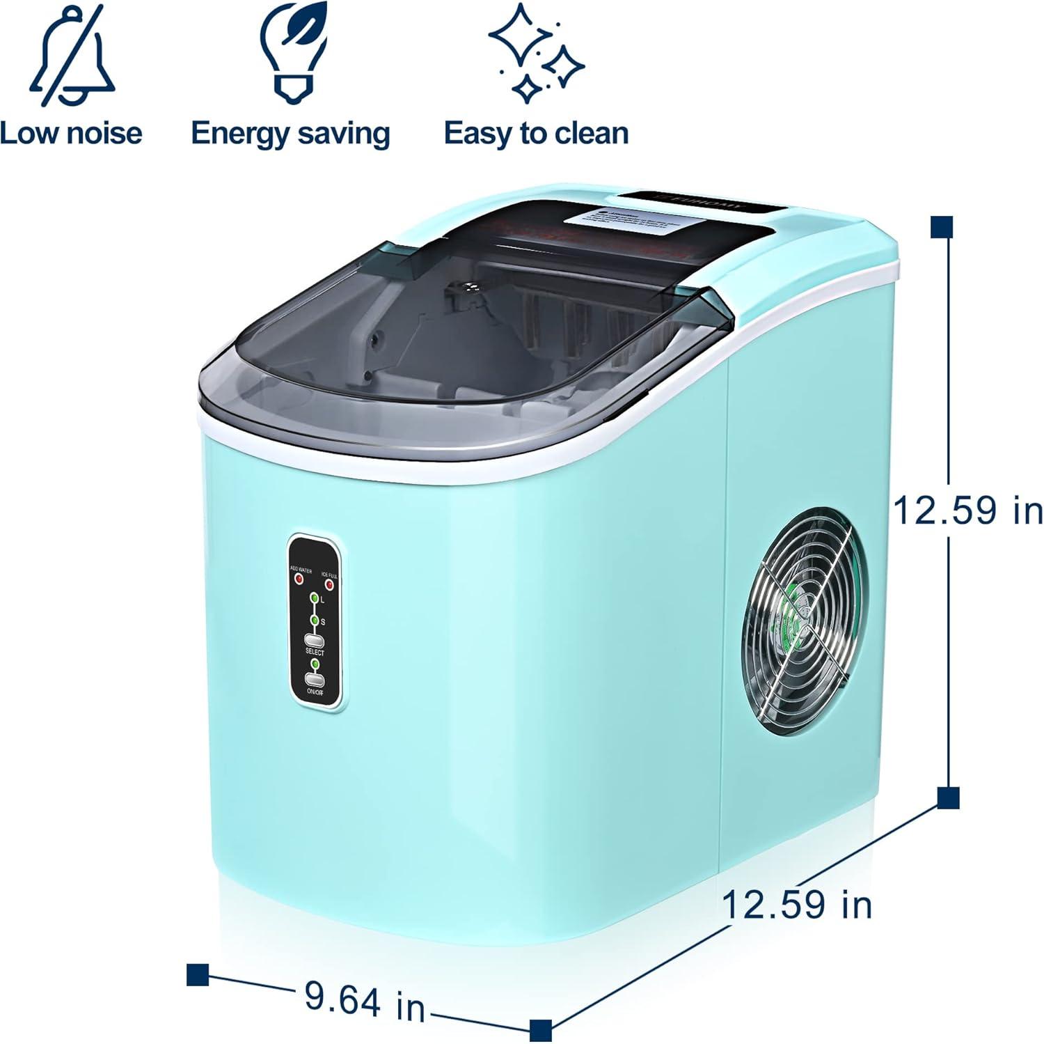 Compact Design & Hanging Ice Scoop: The EUHOMY compact ice maker countertop features a compact footprint (11.8″ x 9.1″ x 13.1″) that fits effortlessly on any countertop or table. Perfect for homes, offices, kitchens, RVs, and more, this portable ice maker machine includes a cleverly designed hanging scoop that's always within reach yet never in the way. The convenient scoop holder keeps your workspace tidy while ensuring easy access to freshly made ice.