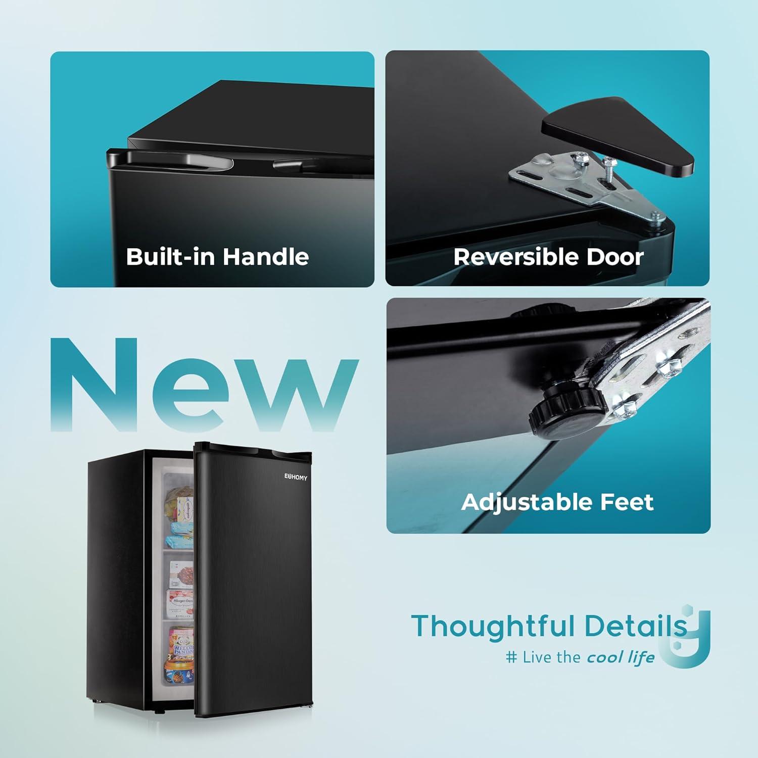 DETAIL OPTIMIZATION – Euhomy freezer have designed some additional functions that are different from those on the market according to people's habits and needs. REVERSIBLE DOOR: It is easy to change the direction of the door switch. ADJUSTABLE FEET: keep the machine from being corroded by moisture on the ground. BUILT-IN HANDLE: not only easier to open the freezer door, ut also makes the freezer more simple and beautiful